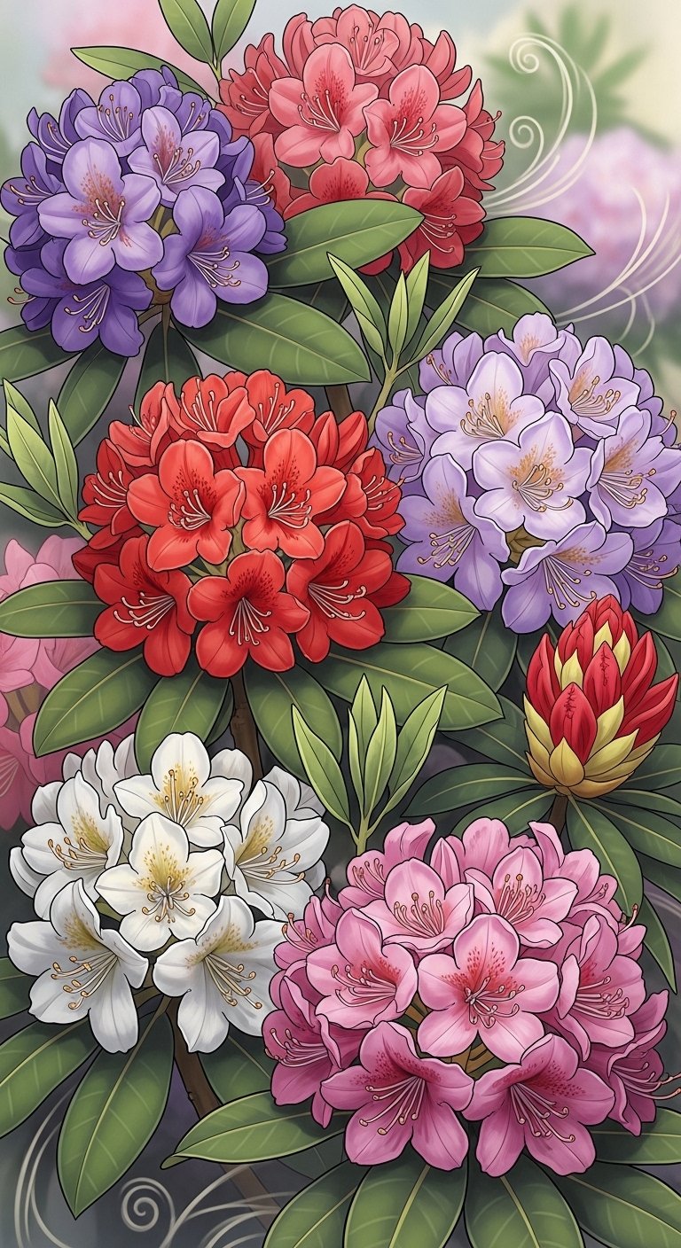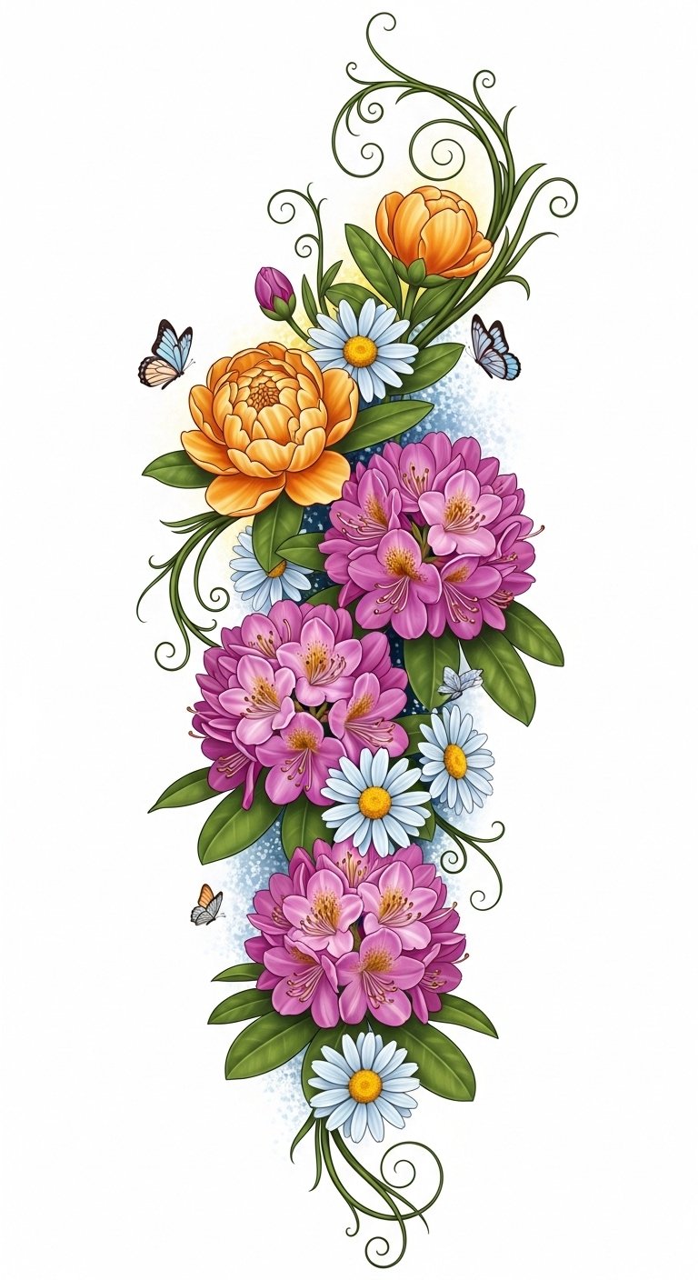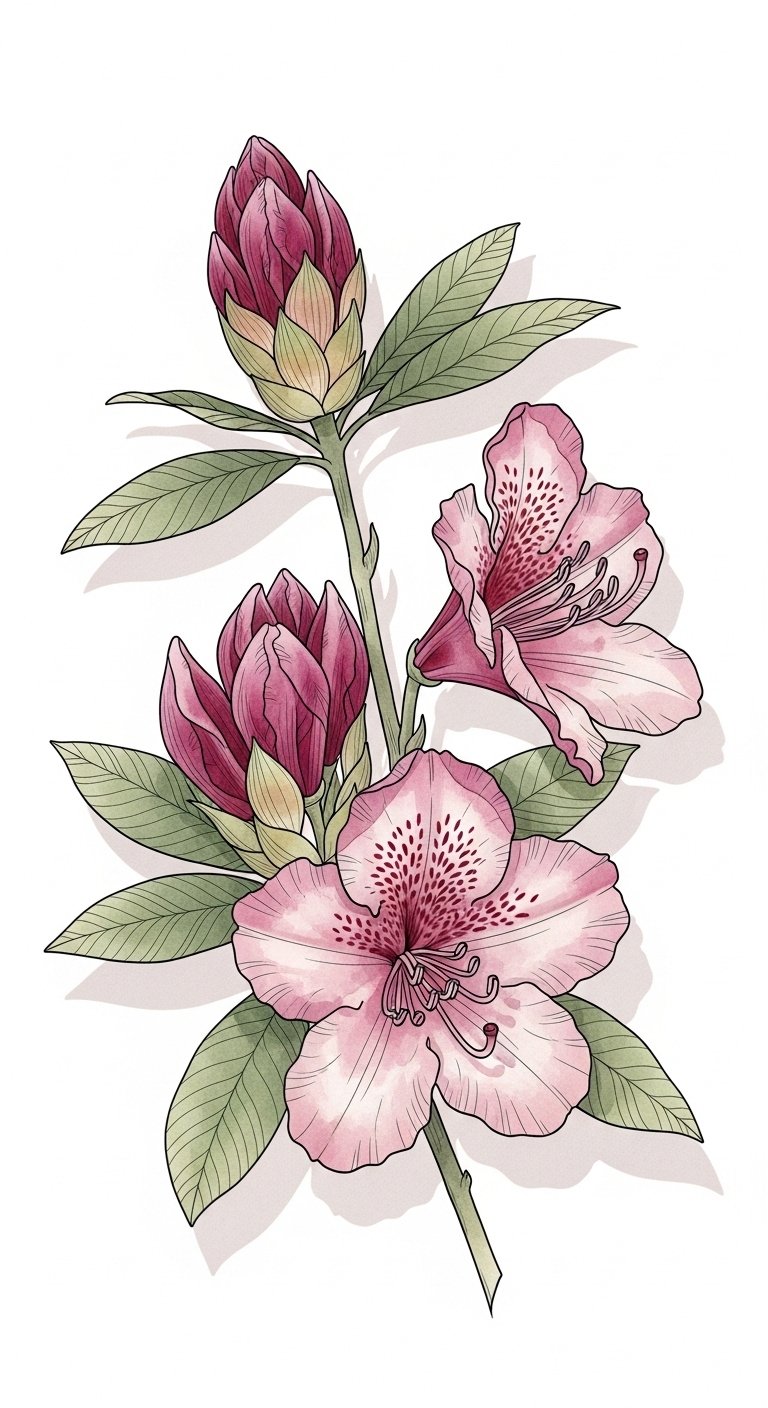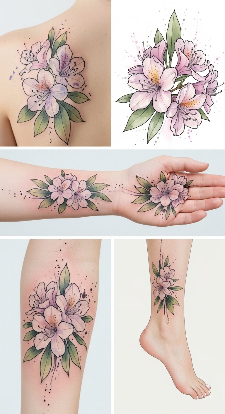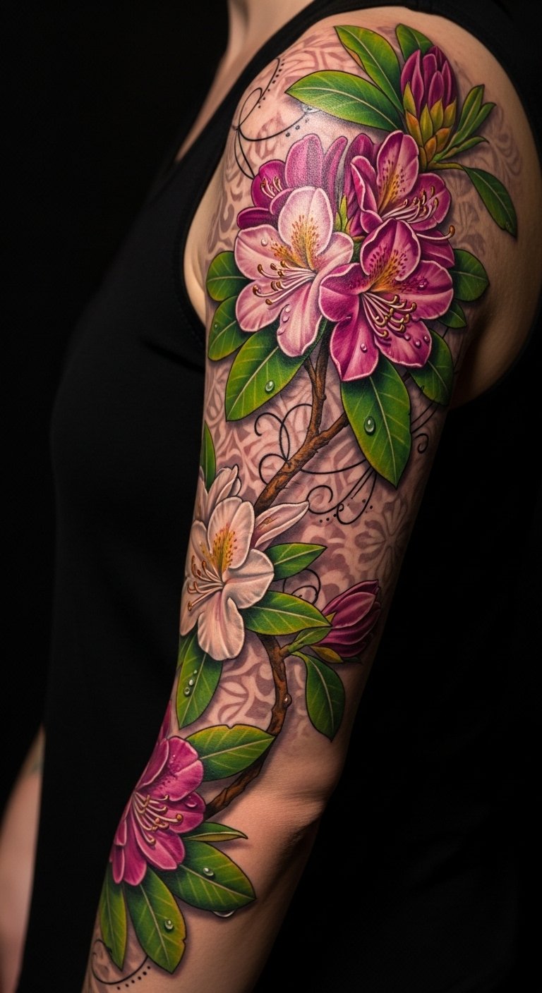A flowing, botanical tattoo design that captures the original text’s imagery: a cluster of rhododendron blooms in varied sizes and colors (soft pinks, deep magentas, creamy whites), layered with textured leaves and subtle dew drops, composed to follow the curve of the shoulder blade or forearm. Symbolically, the rhododendron represents resilience, beauty, and a connection to natural freedom; emotionally the piece balances delicate grace with bold presence, evoking both tranquility and vitality. Placement options: across the shoulder/upper back for a sweeping, expressive display, or as a vertical forearm piece for a more intimate, wearable statement.
