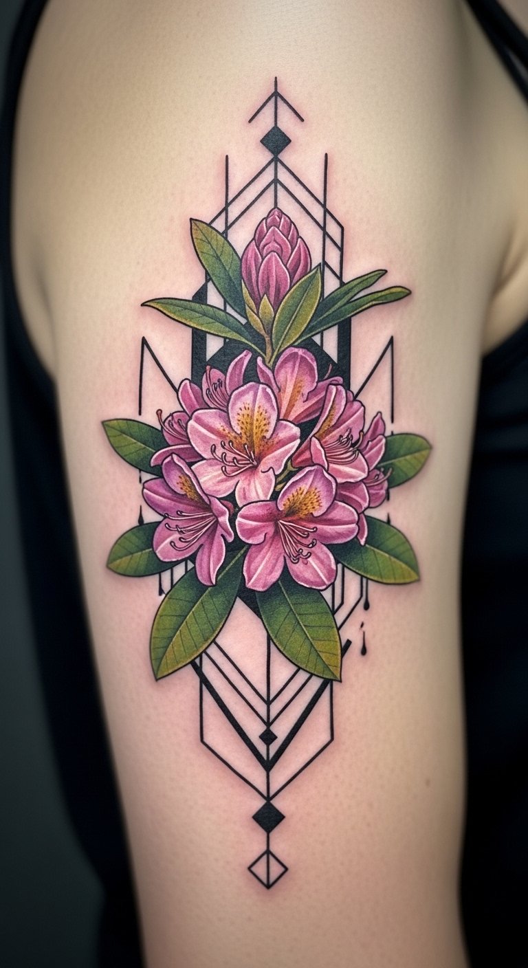 This design concept layers a central rhododendron blossom rendered in realistic color and delicate shading over interlocking geometric frames—hexagons, triangles, and a circular mandala—to create tension between organic curves and precise lines.