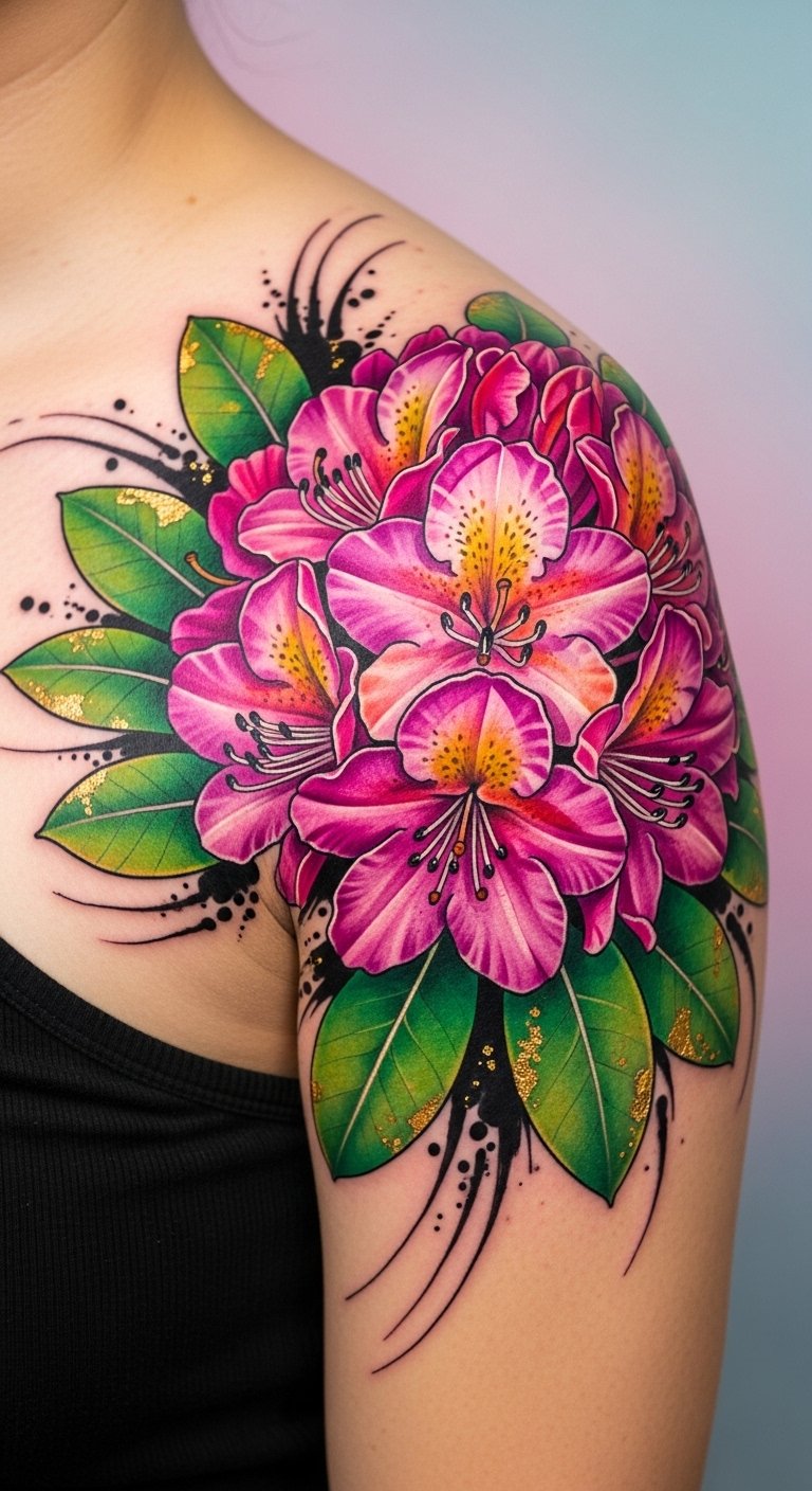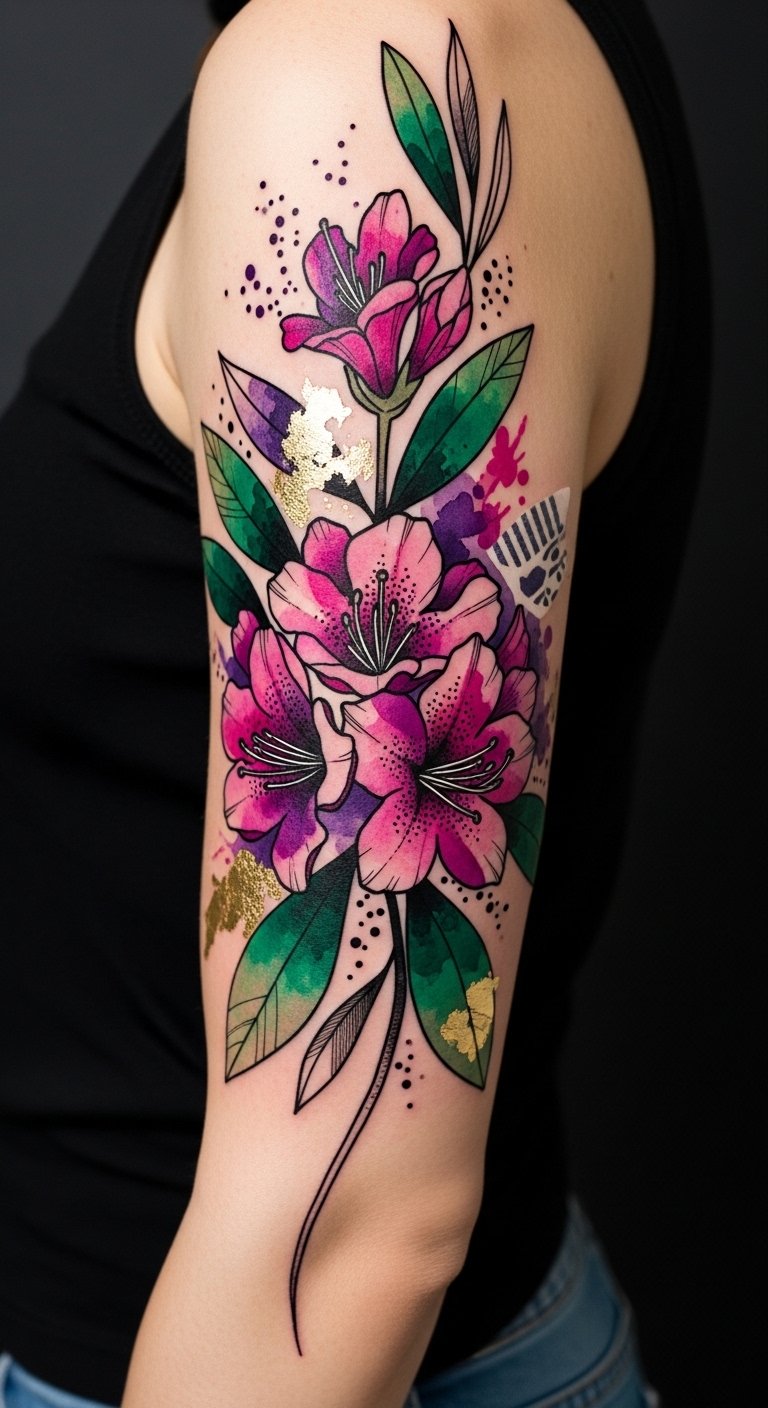 Delicate rhododendron blooms rendered in a mixed-style tattoo: central cluster in bold neo-traditional lines with deep magenta, coral, and soft white highlights; surrounding foliage in loose watercolor washes of emerald and sage with subtle ink splatter; fine-line bees and a small crescent moon woven among petals; placement along the outer forearm or shoulder blade, size medium; high-contrast shading for depth, minimal background negative space to let colors pop. Symbolically this design blends passion (vibrant blooms) with tranquility (soft greenery and moon), evoking growth, resilience, and a reverence for nature; emotionally it feels both bold and gentle, perfect for someone who wants visible connection to the natural world while retaining a personal, introspective touch.