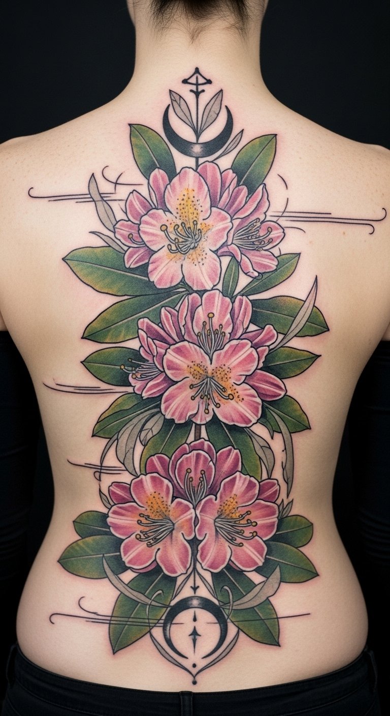 Large back tattoos featuring rhododendrons can transform your canvas into a breathtaking masterpiece, celebrating the flower’s vibrant beauty and resilience.