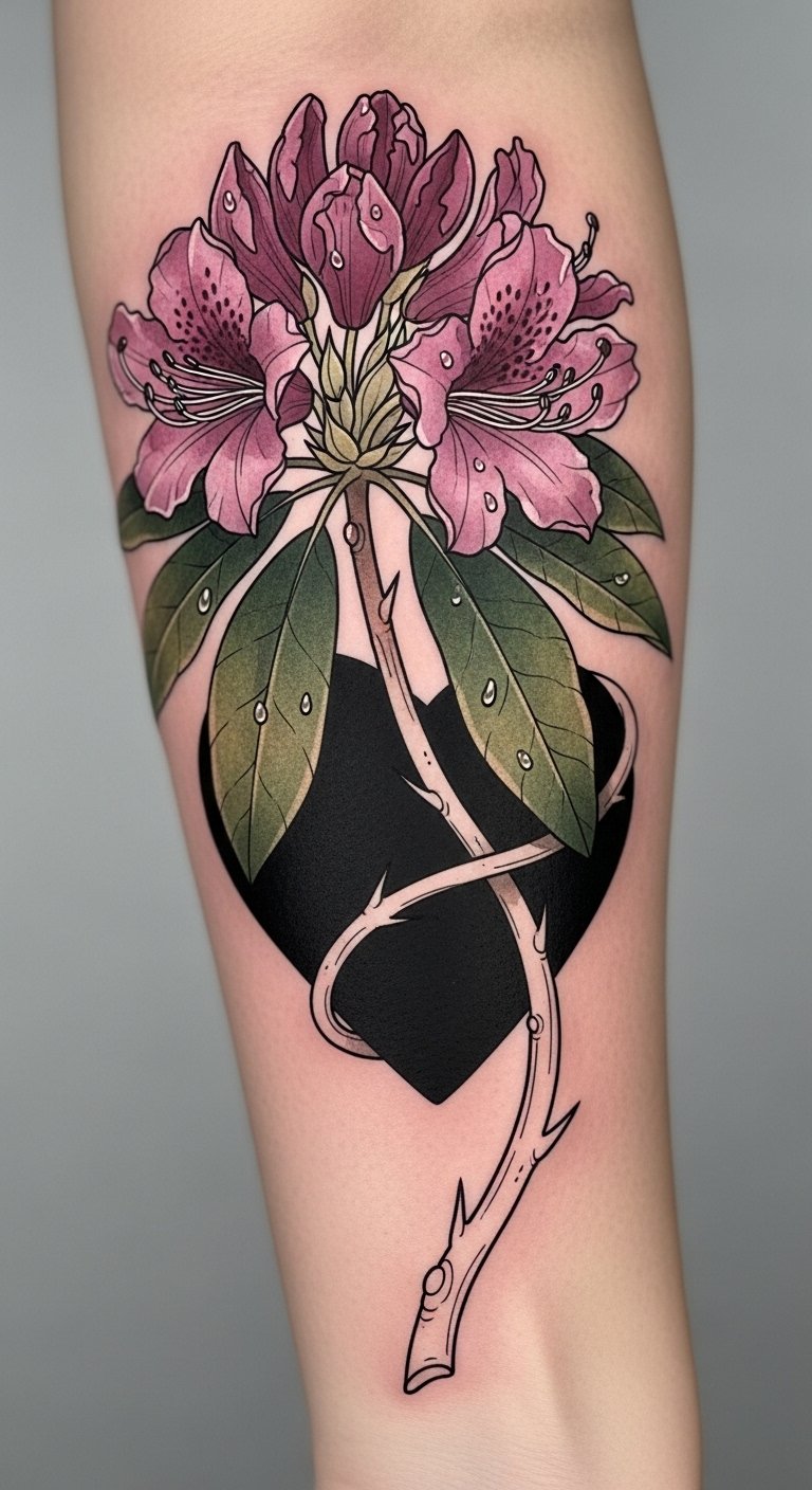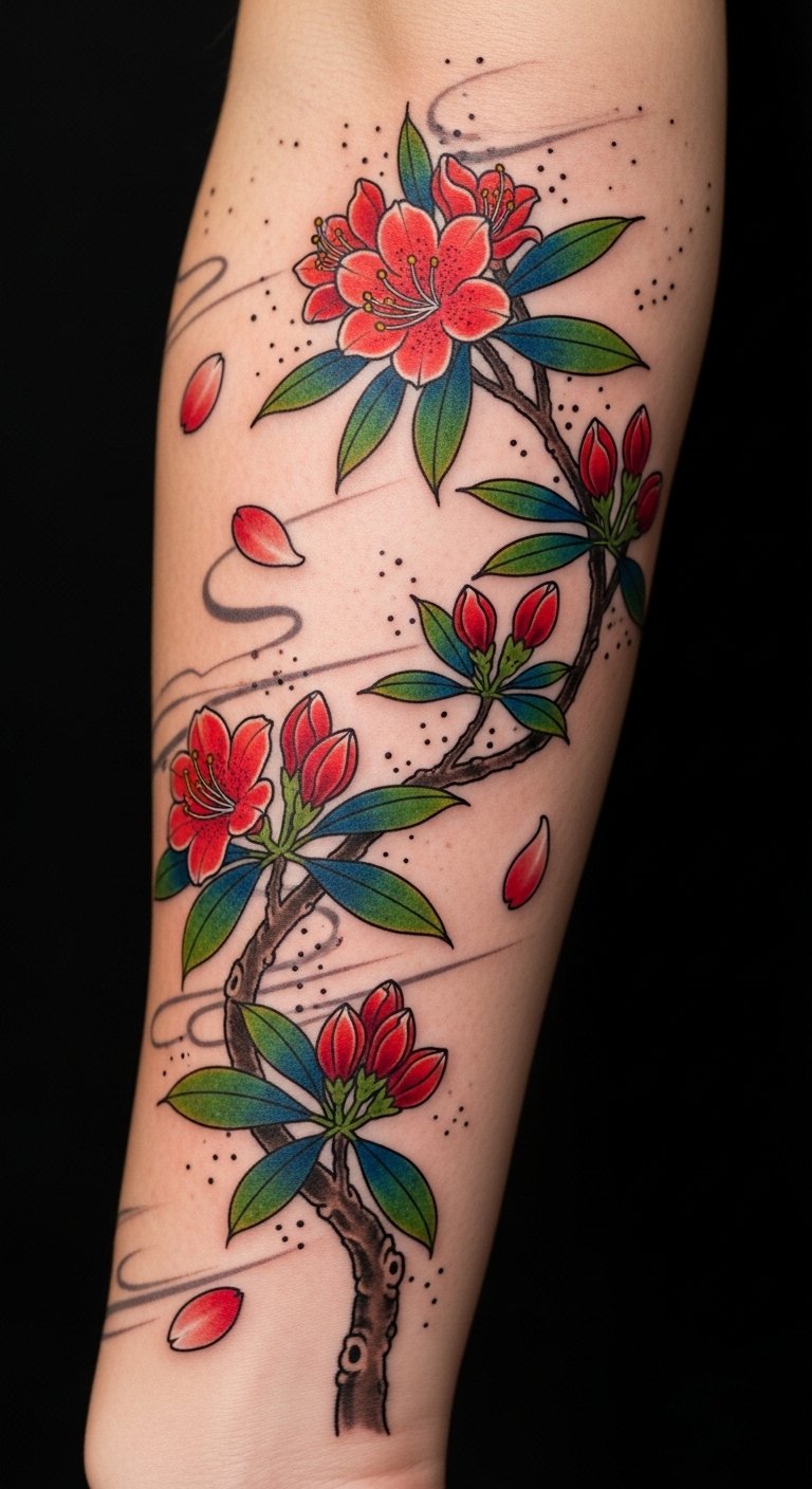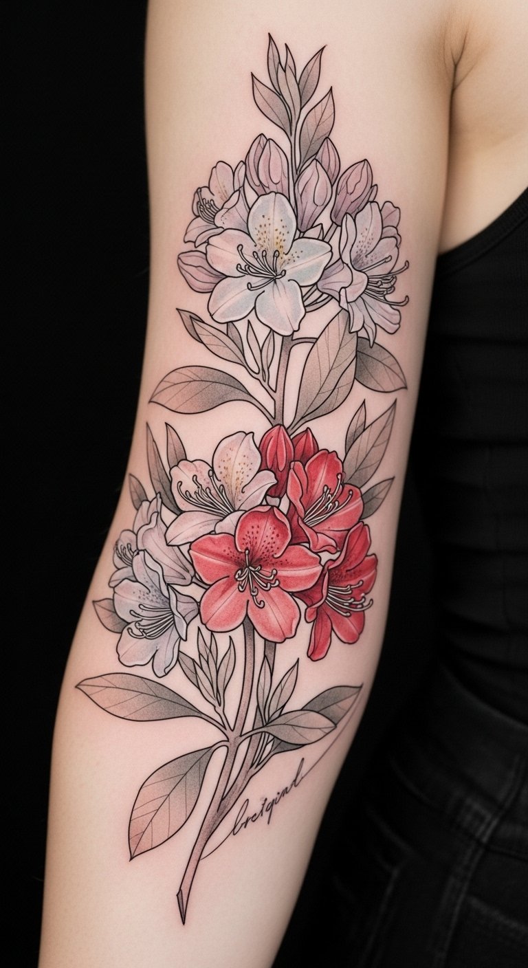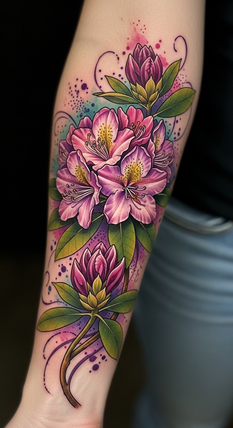 The design symbolizes resilience and rebirth, evoking gentle strength and emotional warmth through the rhododendron’s lush blooms and flowing stems; placed along the outer forearm it follows natural lines for visibility and intimacy, allowing color and detail to convey personal memories, passion, and a connection to nature while the composition’s negative space gives breathing room and movement.