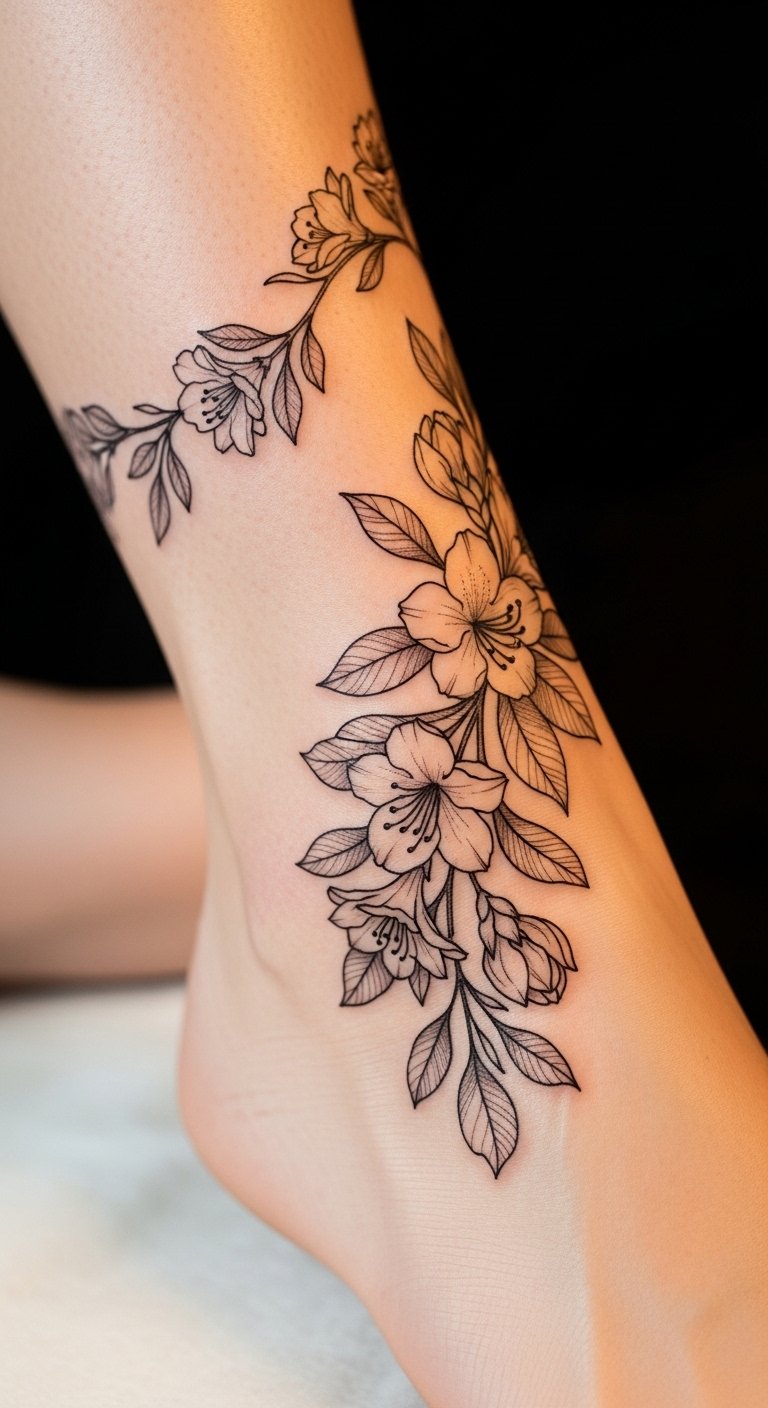 The rhododendron symbolizes resilience, renewal, and the quiet strength found in nature; positioned on wrist and ankle it becomes a personal talisman—visible in moments of movement, reminding the wearer of freedom, beauty, and enduring energy while blending seamlessly with everyday style.