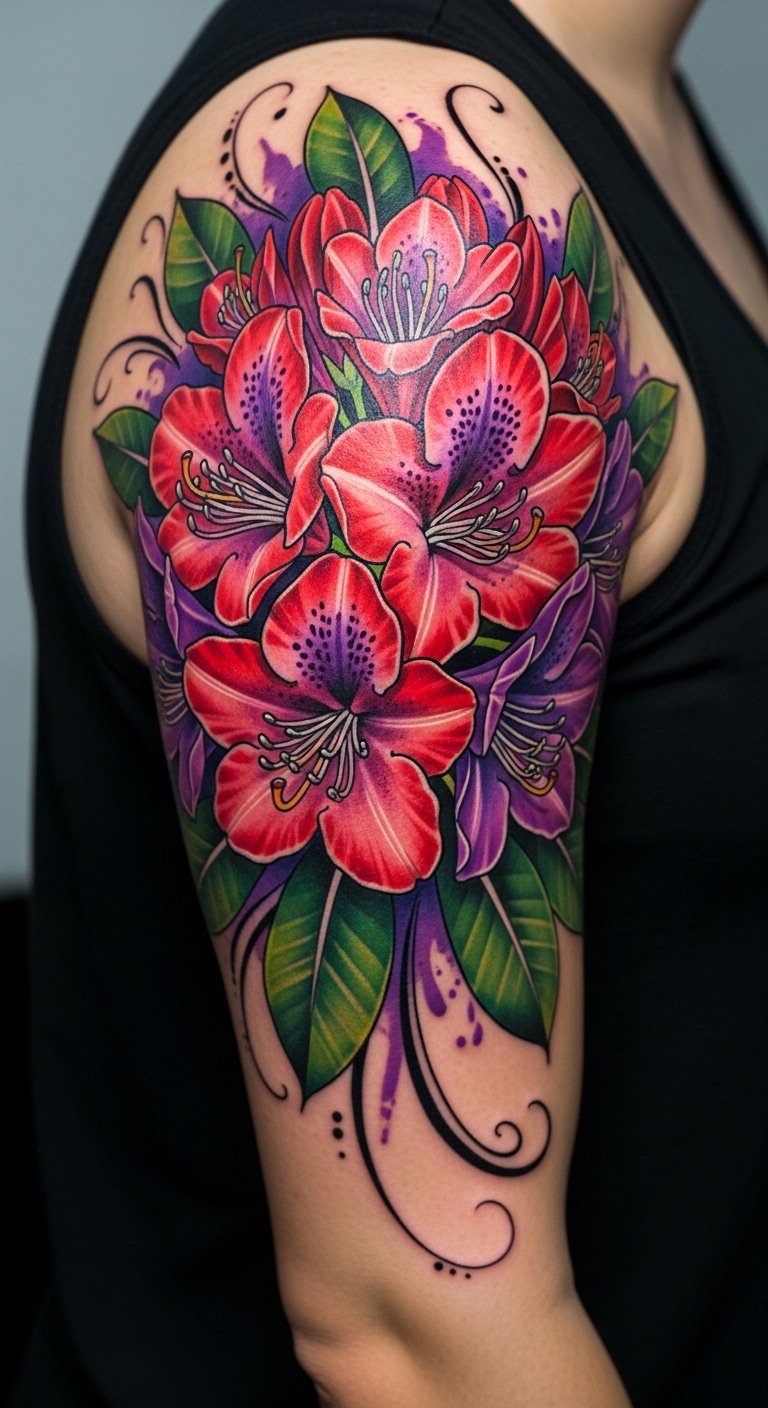 Vibrant and striking, bold red and purple rhododendron tattoos command attention and evoke a sense of passion and energy. These designs embody bold rhododendron symbolism, representing liveliness and strength.
