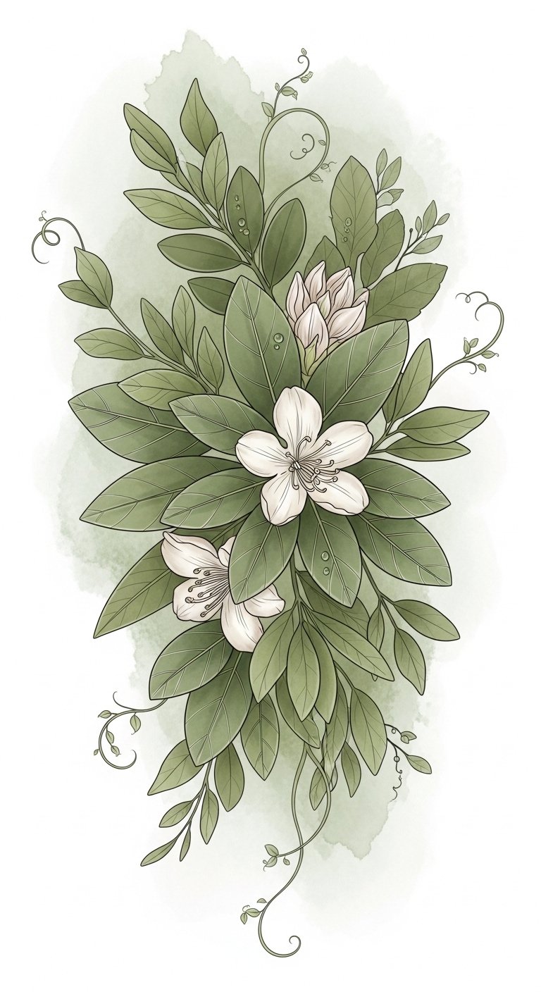Rendered in fine-line realism with saturated watercolor fills, this design centers on a cascading spray of rhododendron blooms and glossy leaves wrapping gently around the forearm or shoulder blade. Symbolically, the rhododendron conveys passion, resilience, and personal growth; emotionally the piece evokes quiet strength and a free, nature-attuned spirit. Placement along a curved area—forearm, ribcage, or clavicle—allows the composition to flow with the body, making the tattoo feel like a living extension of the wearer’s story.