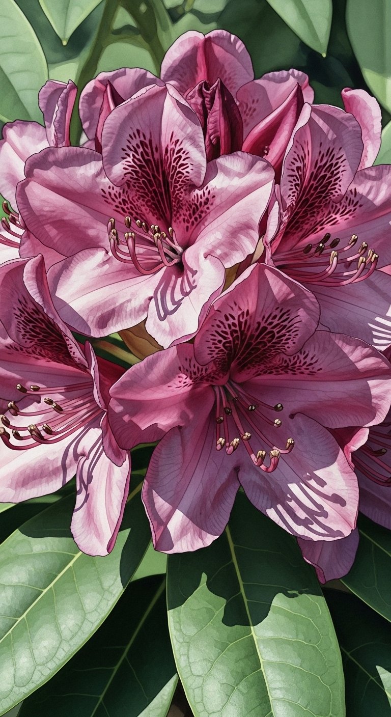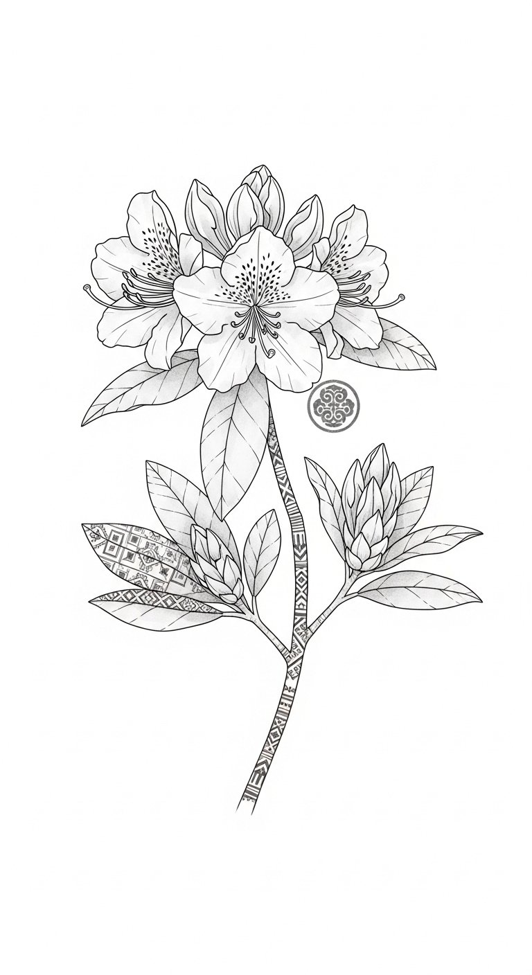 The design uses the rhododendron as a focal point while the surrounding foliage symbolizes renewal, protection, and the interdependence of growth; emotion conveyed is serene confidence and gentle resilience.