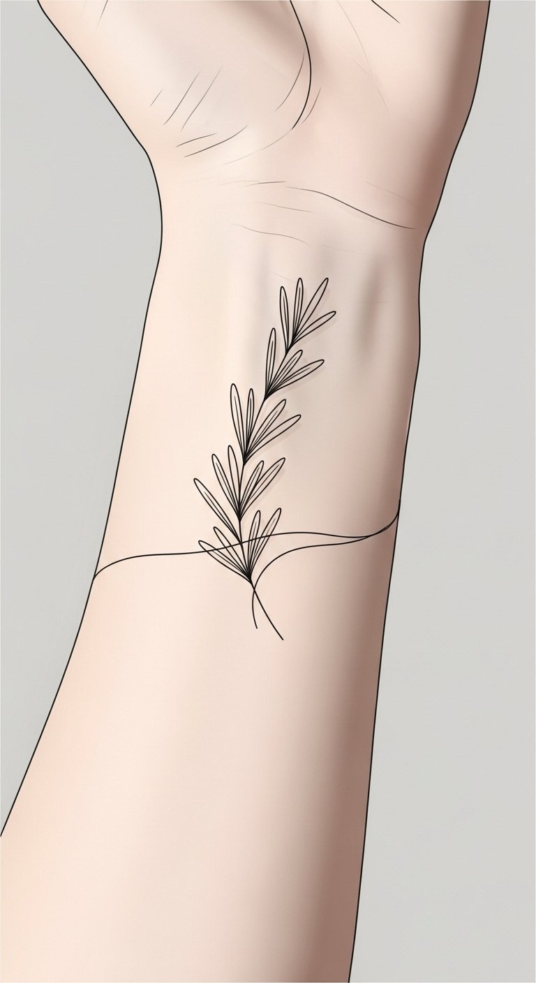The elegance of a single rosemary stem on your wrist captures both beauty and meaning in a minimalist design. This simple yet striking tattoo symbolizes remembrance and courage, allowing you to carry its essence with you. Perfectly placed on your wrist, it serves as a subtle reminder of your journey, making a bold statement while embracing your desire for freedom and self-expression. The design evokes quiet resilience—thin, clean lines for the stem with delicate needle-like leaves; optional light shading or dotwork adds texture without losing minimalism. Placed along the inner wrist or wrapping slightly around the forearm, it reads as both intimate and visible, meant to be a tactile anchor during reflective moments and a graceful emblem of personal strength.