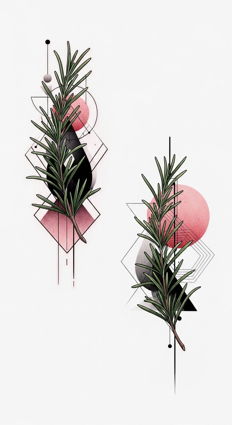 These designs blend organic rosemary sprigs with sharp geometric frames and abstract shapes to evoke resilience and remembrance; the rosemary symbolizes memory and strength while the geometry adds modern structure and balance.