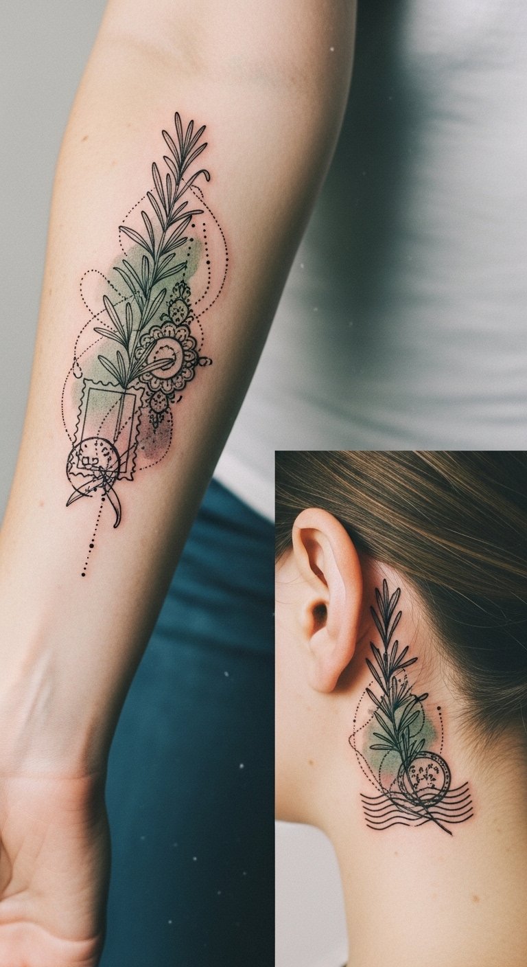 Place the composition to curve from upper arm toward elbow, allowing rosemary stems to guide visual flow and leave breathability with negative-space highlights so the piece reads well both close-up and at a distance.
