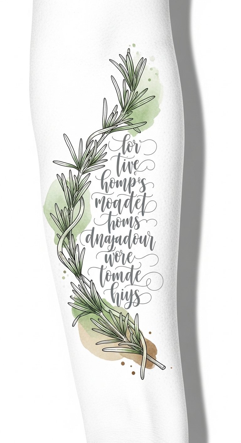 Think of quotes that resonate deeply with you, turning your tattoo into a powerful symbol of freedom and self-expression. This placement—along the inner forearm or gently curving at the rib—lets the sprig cradle the script, conveying protection and remembrance; the rosemary symbolizes memory and resilience, the flowing quote expresses personal truth, and the soft watercolor tones keep the piece intimate and emotionally grounded.