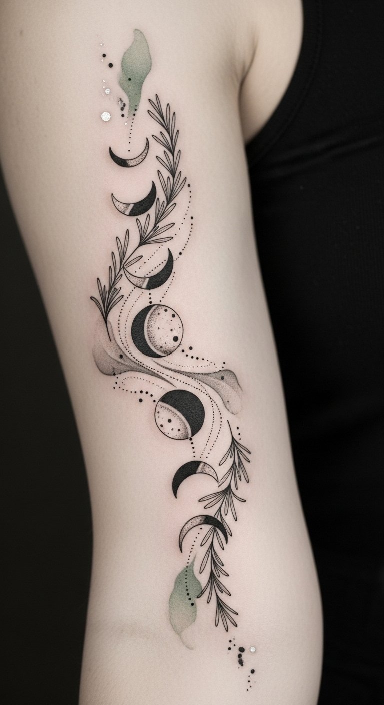 What better way to symbolize the cyclical nature of life than with a rosemary and moon phases tattoo?