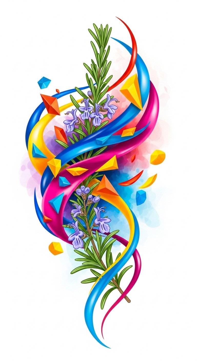 This design blends botanical clarity with abstract movement: colorful rosemary sprigs rendered in saturated greens, teals, purples and warm accents, woven through geometric and freeform shapes—circles, brushstroke swaths, and subtle ink splatters—to evoke growth, memory, and resilience.