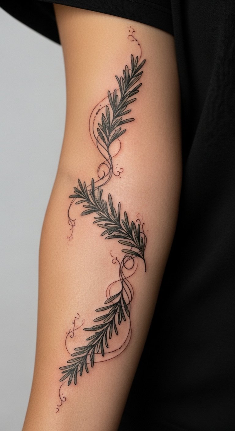 As a tattoo concept, the rosemary vine encircling the arm symbolizes remembrance, resilience, and continuous growth; delicate needle-like leaves and subtle shading can evoke both botanical realism and graceful movement, while occasional tiny flowers or dew highlights add softness and life.