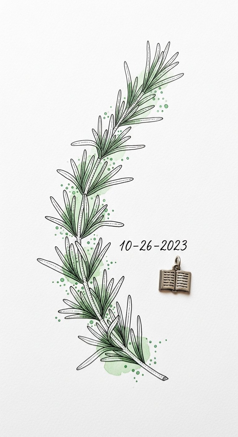 Whether it’s a cherished date or a beloved quote intertwined with rosemary, these meaningful designs won’t only enhance your style but also celebrate your individuality. This design blends the rosemary’s associations with remembrance and resilience with the intimate markers (date, book) to evoke memory, growth, and quiet strength.