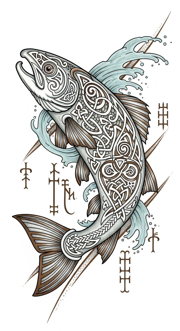 This design symbolizes resilience and personal journey, the salmon’s upward curve representing strength against current and life’s challenges.