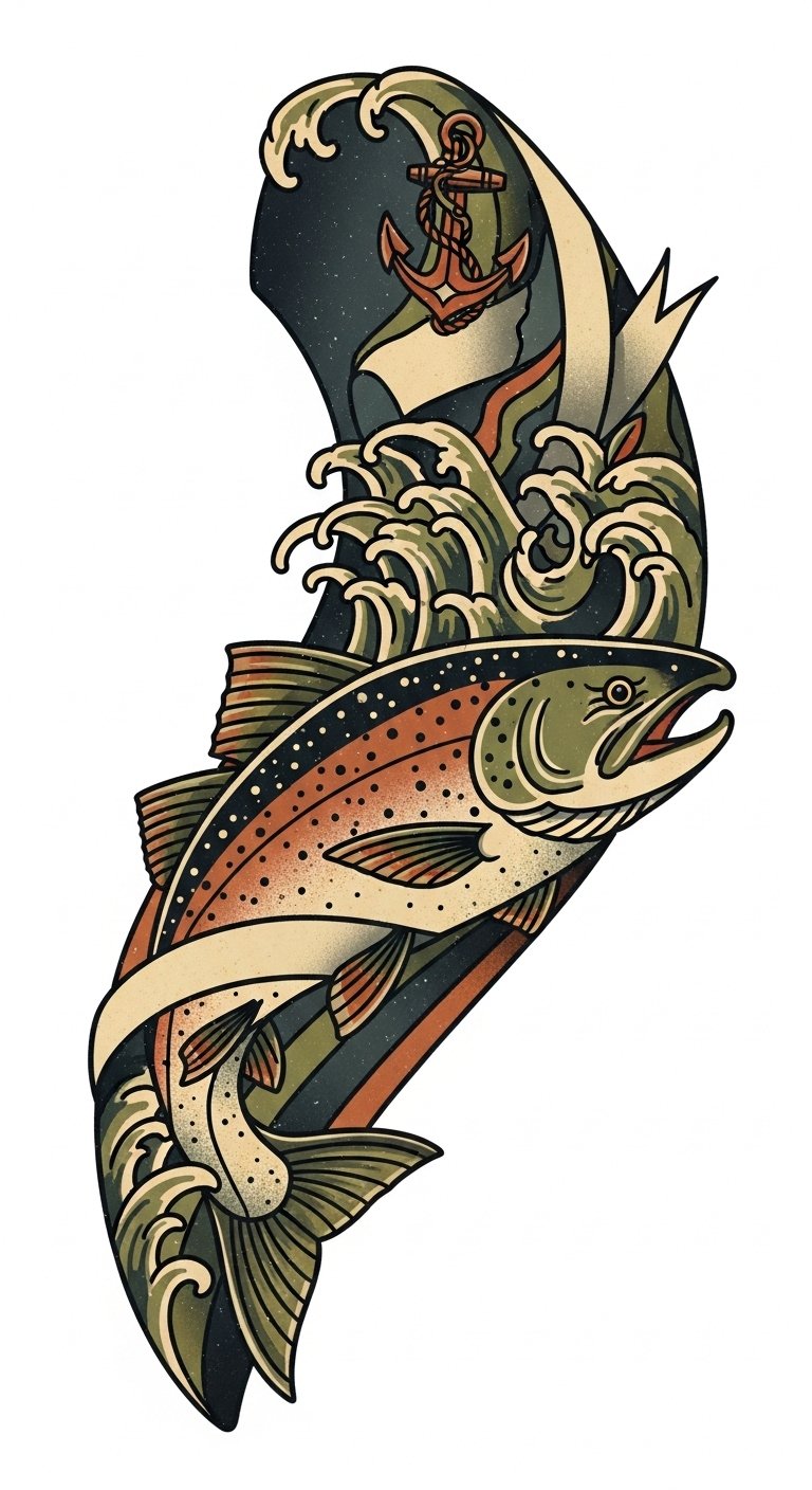 This design concept channels resilience and transformation through a central salmon rendered in flowing watercolor strokes, surrounded by stylized Japanese waves, a subtle dragon silhouette entwined with kelp, and scattered cherry blossoms; emotion leans toward quiet strength and spiritual depth. Ideal placement: a sweeping forearm piece or full side rib panel to allow the dynamic flow of waves and the salmon’s upstream motion, with colors emphasizing teal, coral, indigo, and soft gold highlights to balance tradition and modern artistry.