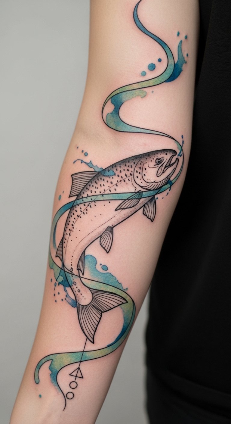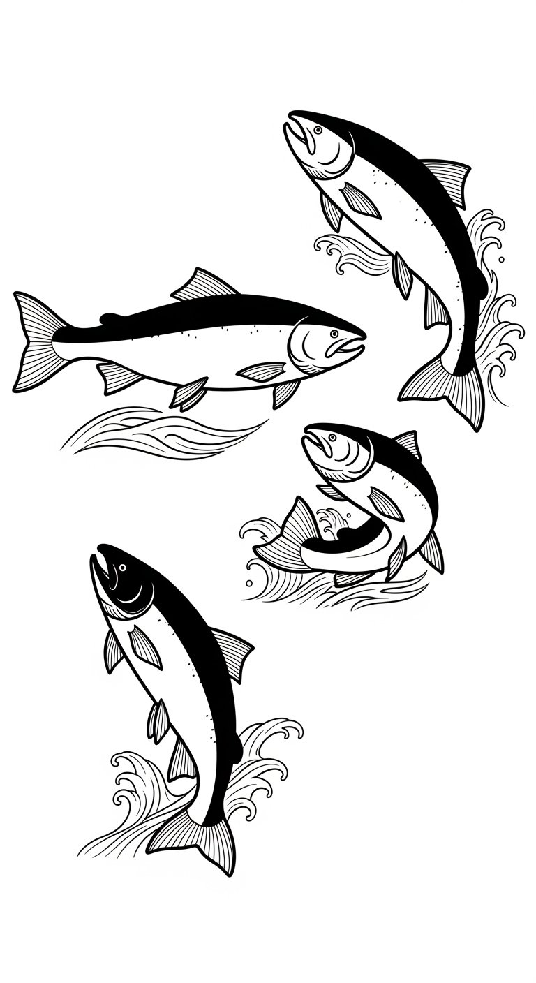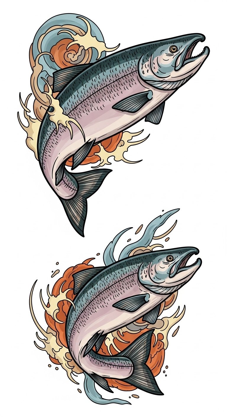 This design concept uses flowing lines and layered waves to convey motion, with a central salmon rendered in mid-leap and trailing water streaks that wrap around the limb or torso to create a sense of continuous movement; symbolism centers on resilience, journey, and freedom, while the energetic composition evokes exhilaration and connection to nature—ideal placement options include forearm or side rib for long, graceful flow or shoulder-to-chest for a powerful, dynamic statement.