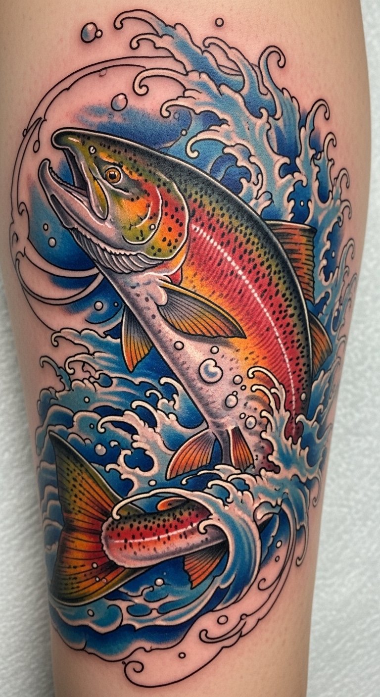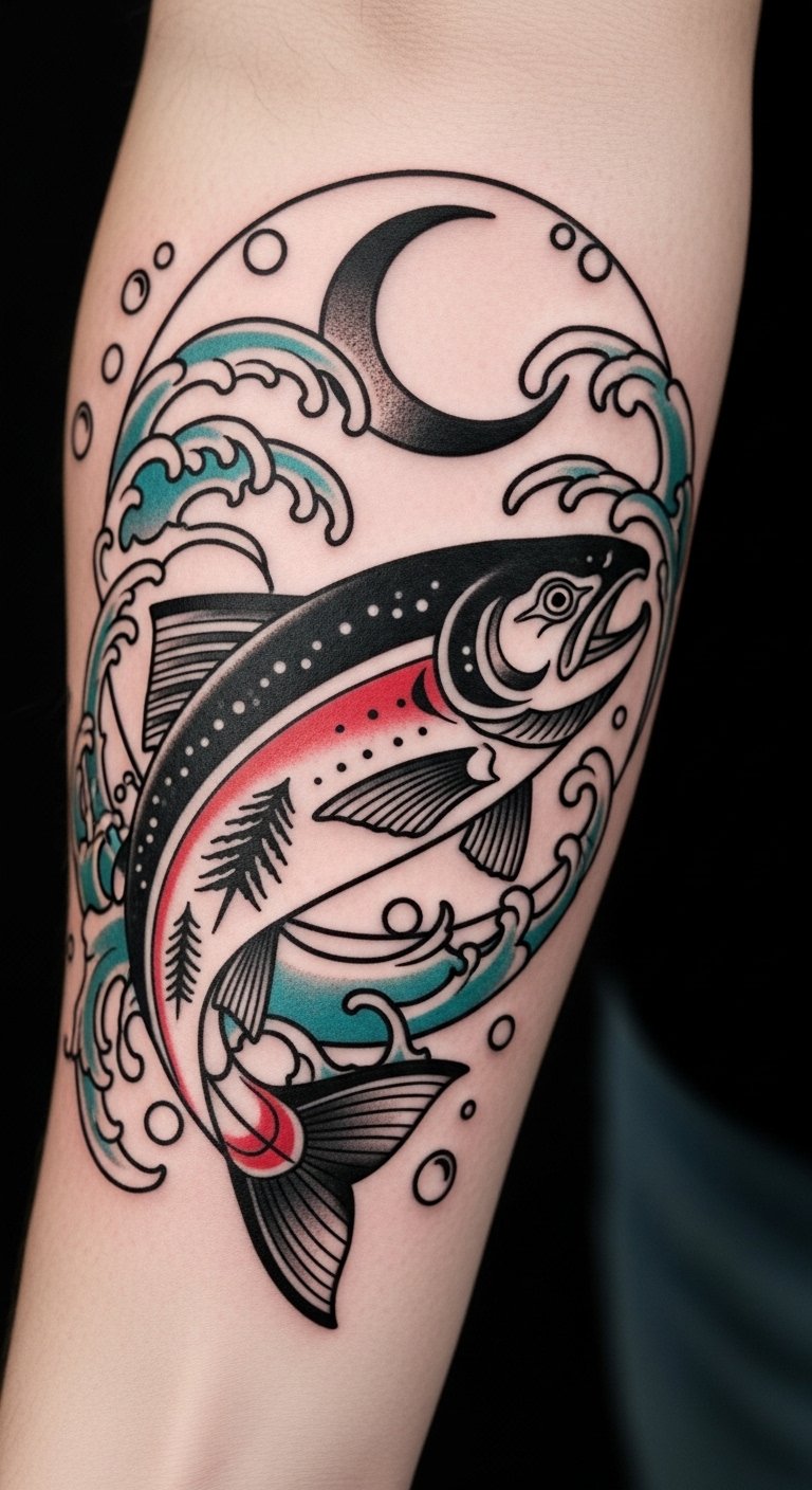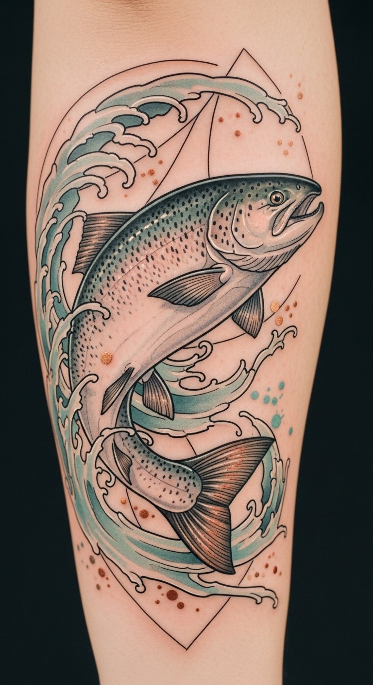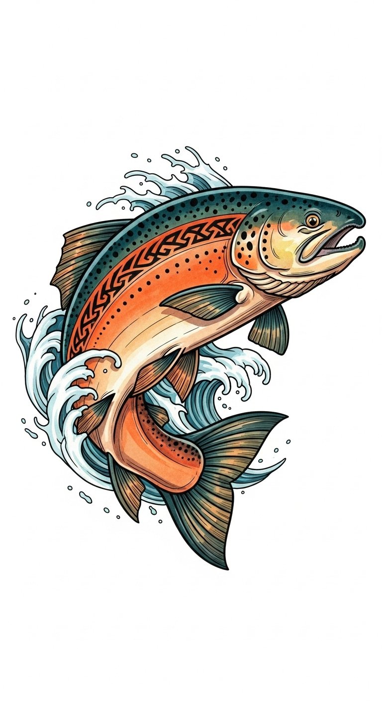 This concept channels motion and resilience—the leaping salmon symbolizes perseverance and return, waves and tribal motifs tie to heritage and flow, while vivid colors evoke passion and individuality; placement on the forearm or calf emphasizes movement and visibility, creating an intimate yet expressive statement.