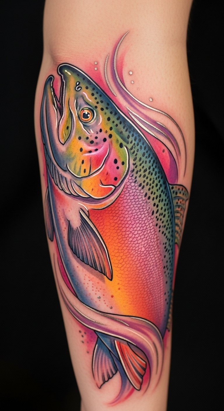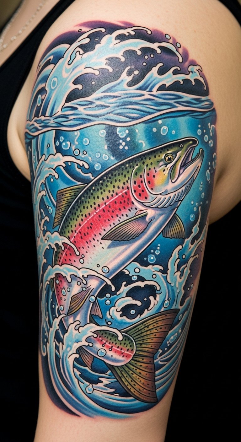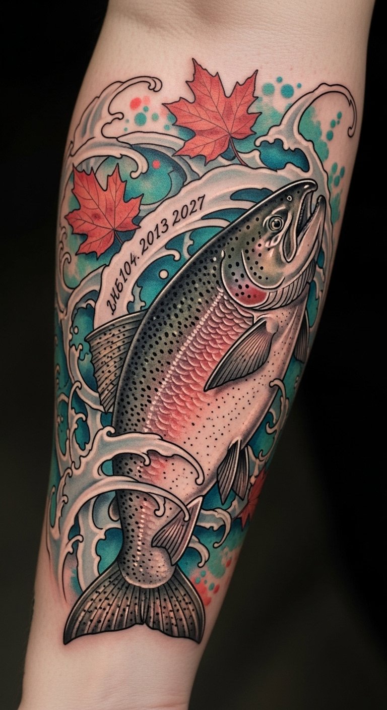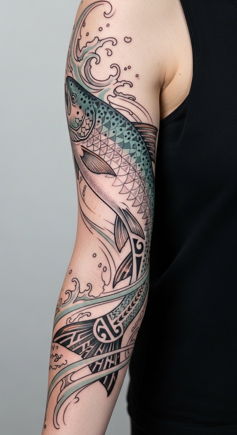 This concept channels motion and resilience—the leaping salmon symbolizes perseverance and return, waves and tribal motifs tie to heritage and flow, while vivid colors evoke passion and individuality; placement on the forearm or calf emphasizes movement and visibility, creating an intimate yet expressive statement.
