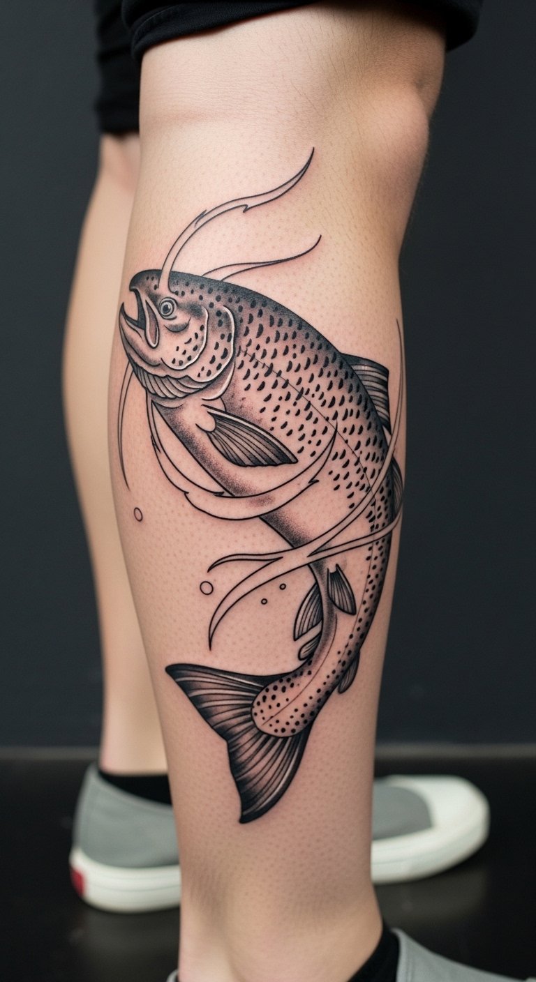 Calf salmon tattoos combine natural movement and personal meaning: the salmon symbolizes resilience, determination, and a life lived against the current, while the calf placement adds visibility and flow with the leg’s musculature.