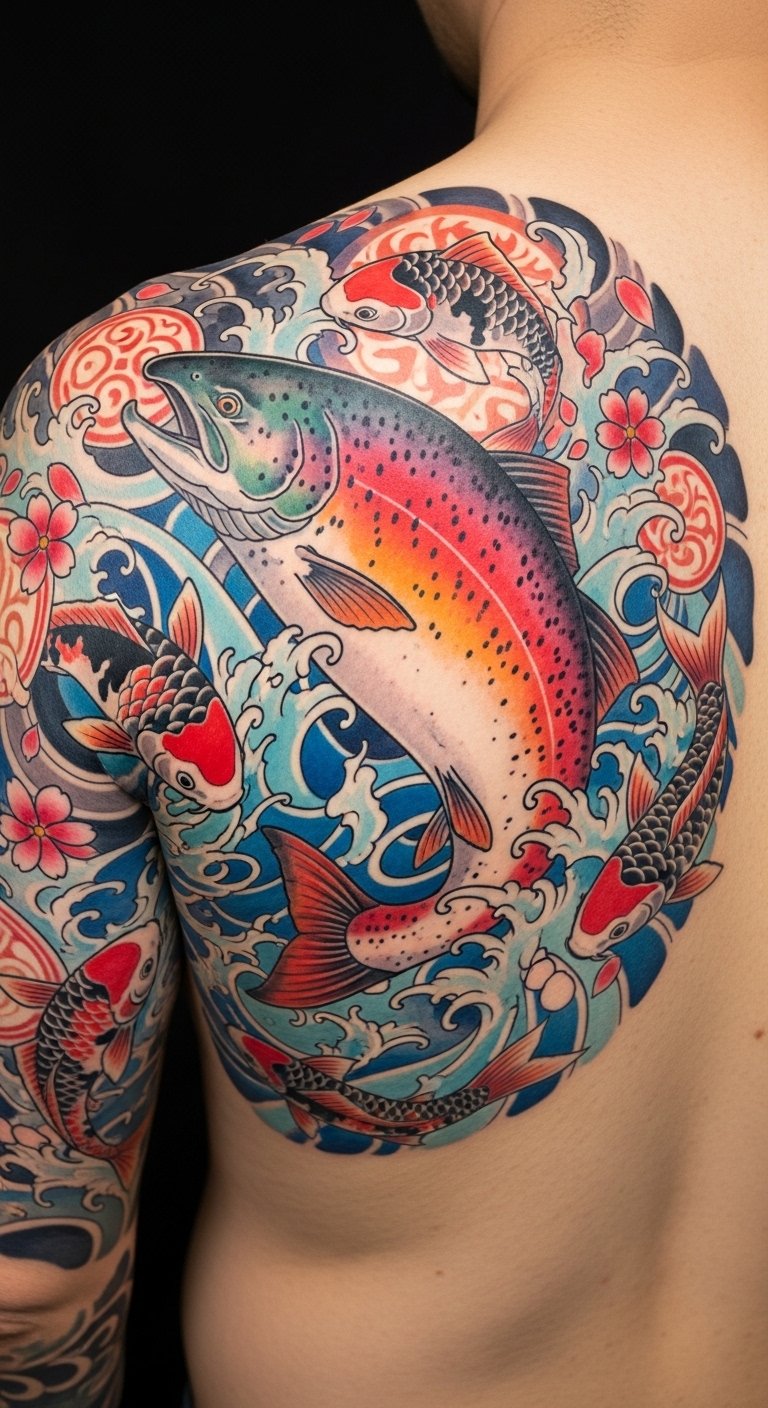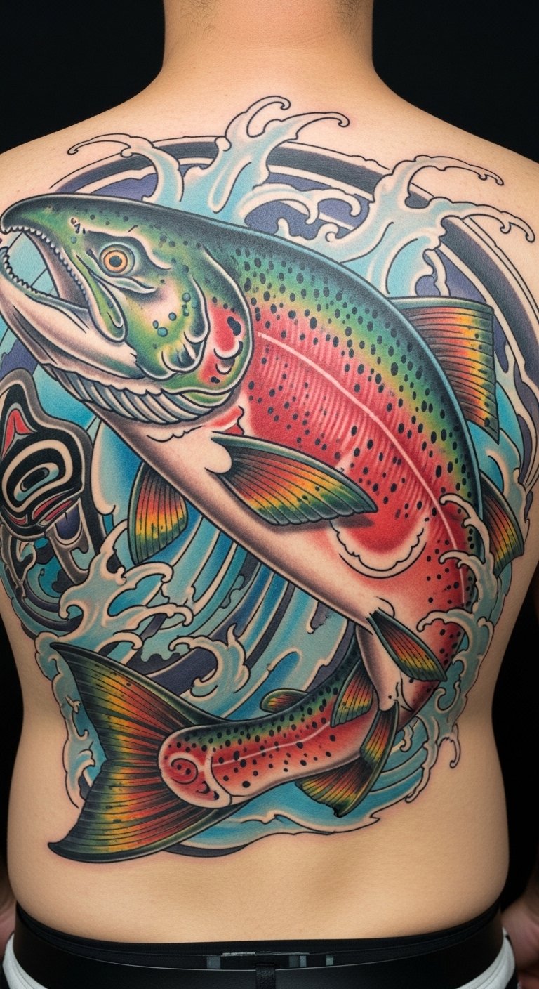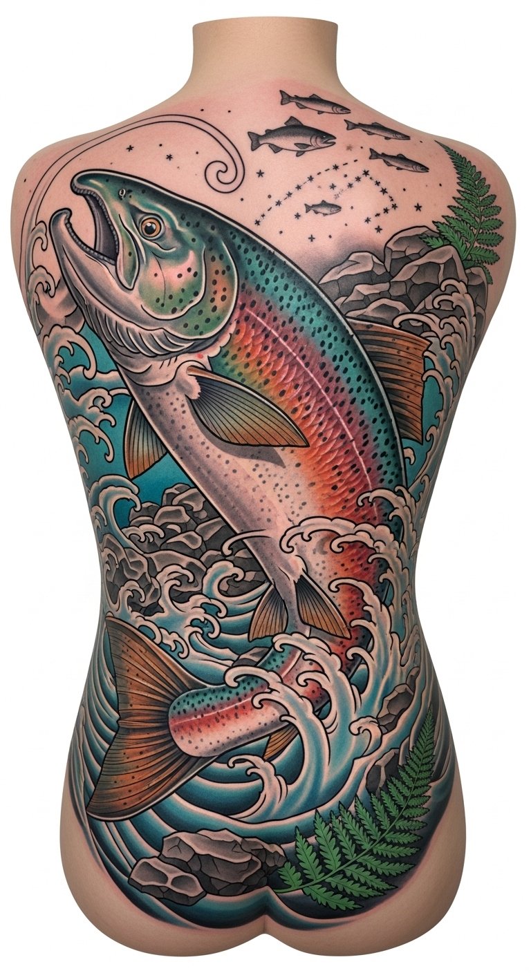 The expansive back placement allows for intricate designs, showcasing the salmon’s journey upstream, symbolizing resilience and transformation.