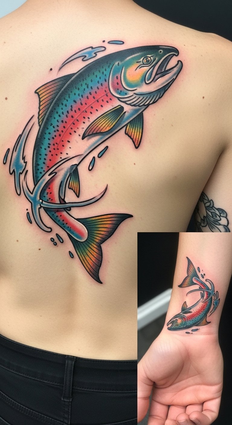 You can opt for larger, intricate pieces that flow with your arm’s natural lines or smaller, minimalist designs that whisper elegance. Whichever tattoo size you choose, your salmon tattoo will embody freedom and individuality, perfectly reflecting your unique journey.