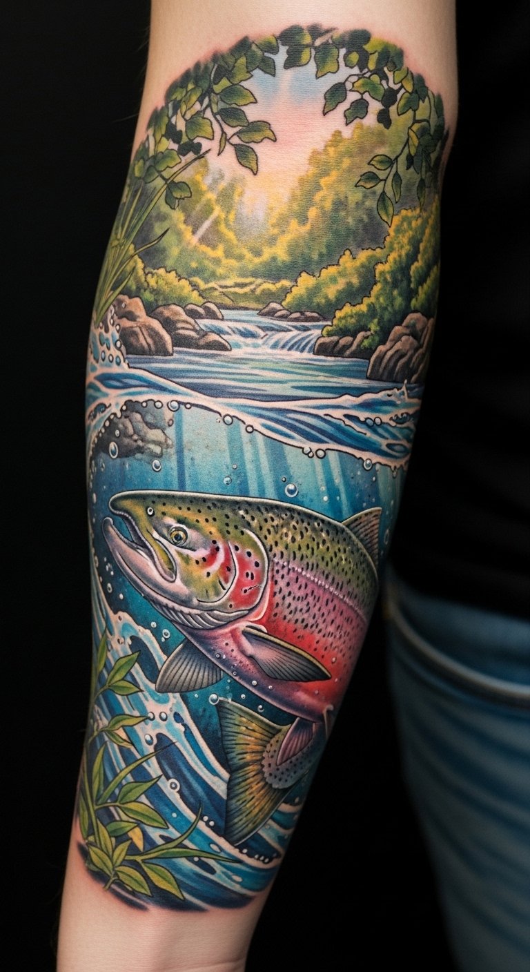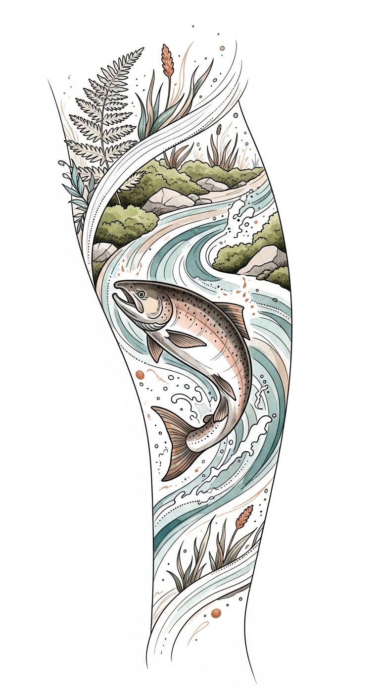 The design evokes resilience and cyclical renewal—salmon as a symbol of determination moving upstream—while the surrounding flora and water convey tranquility and belonging; it suits a forearm, calf, or side rib where the flow of the body complements swimming motion and allows the scene to wrap naturally.