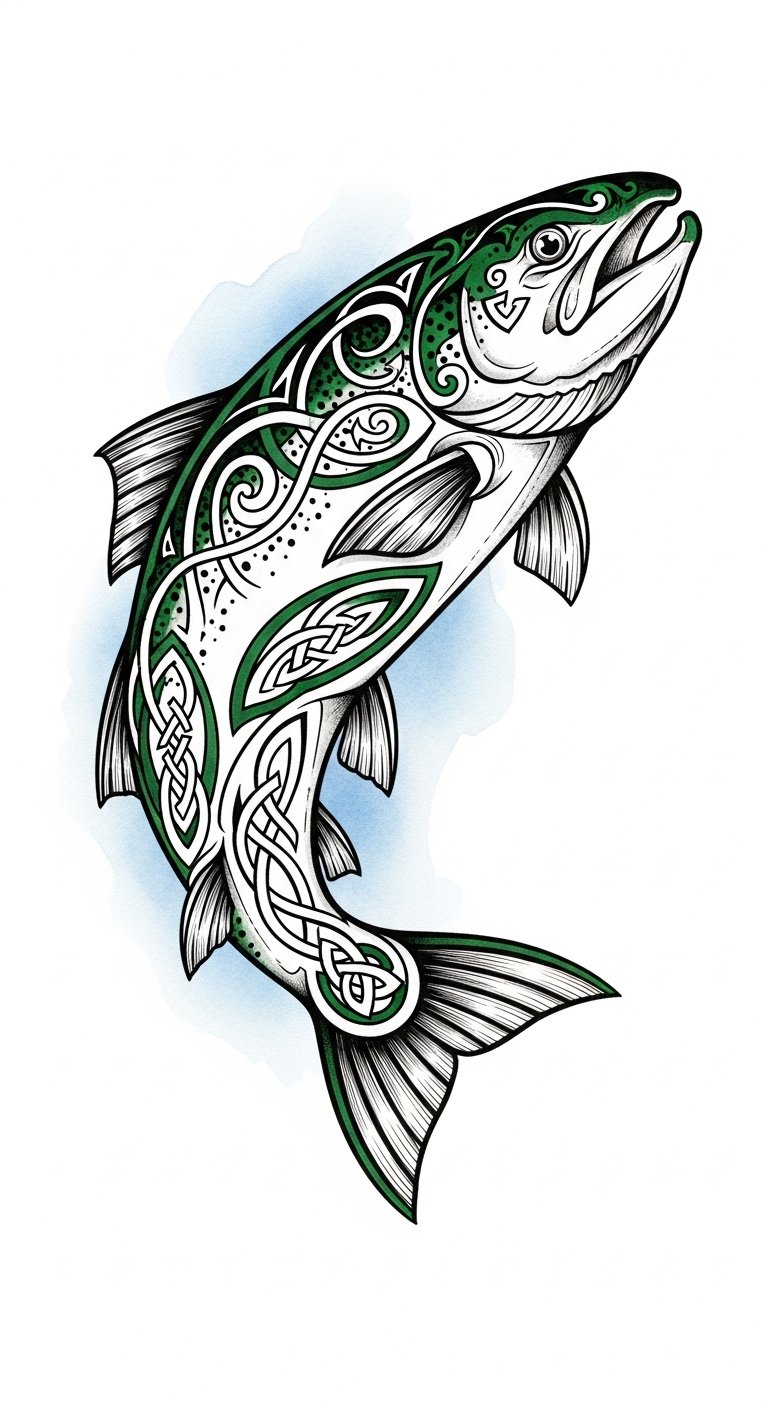 When you merge the elegance of Celtic knots with the symbolism of salmon, you create a tattoo that tells a rich story of heritage and spirituality. The intricate knot patterns intertwine with salmon mythology, reflecting resilience and transformation.