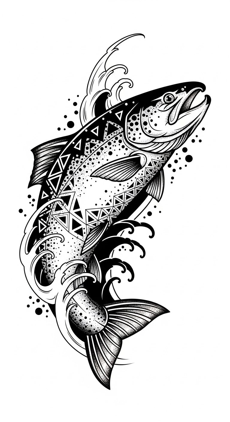 A leaping salmon represents resilience, determination, and the cycle of life; this design conveys emotional strength and forward movement while the geometric wave accents add balance between nature and human-made order.