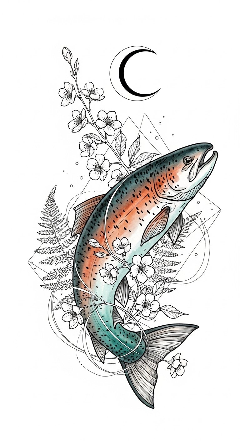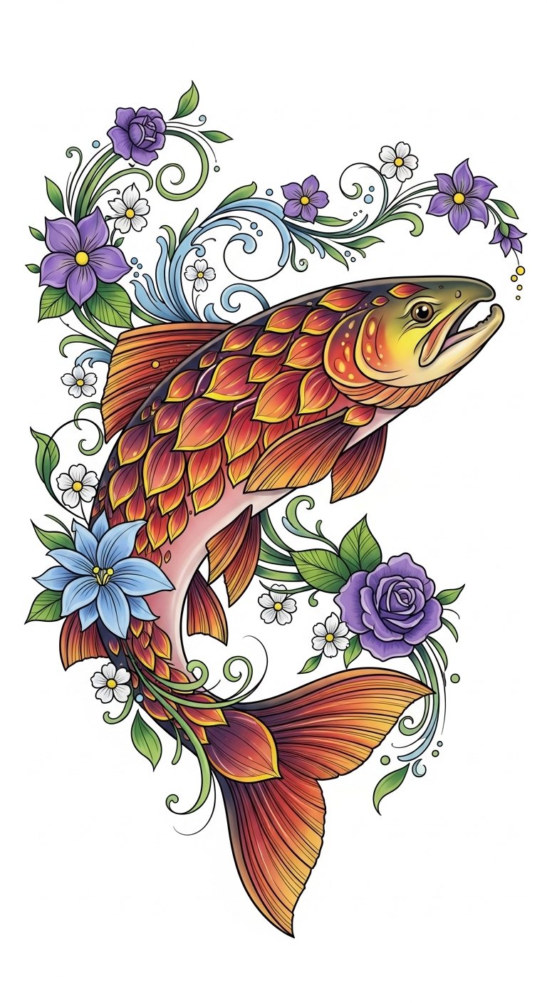 Ideal placements include the forearm or side-rib for a flowing horizontal composition, the shoulder blade for a rounded, cascading arrangement, or the calf for a vertical, travel-oriented piece; color choices can emphasize contrast between the salmon’s warm tones and cooler, complementary floral hues to deepen visual impact.