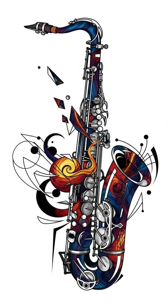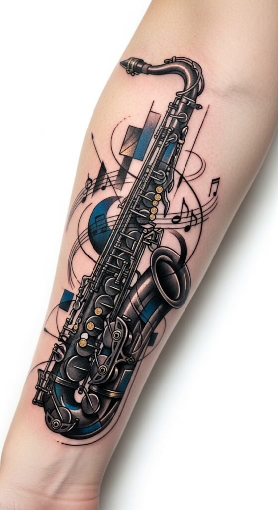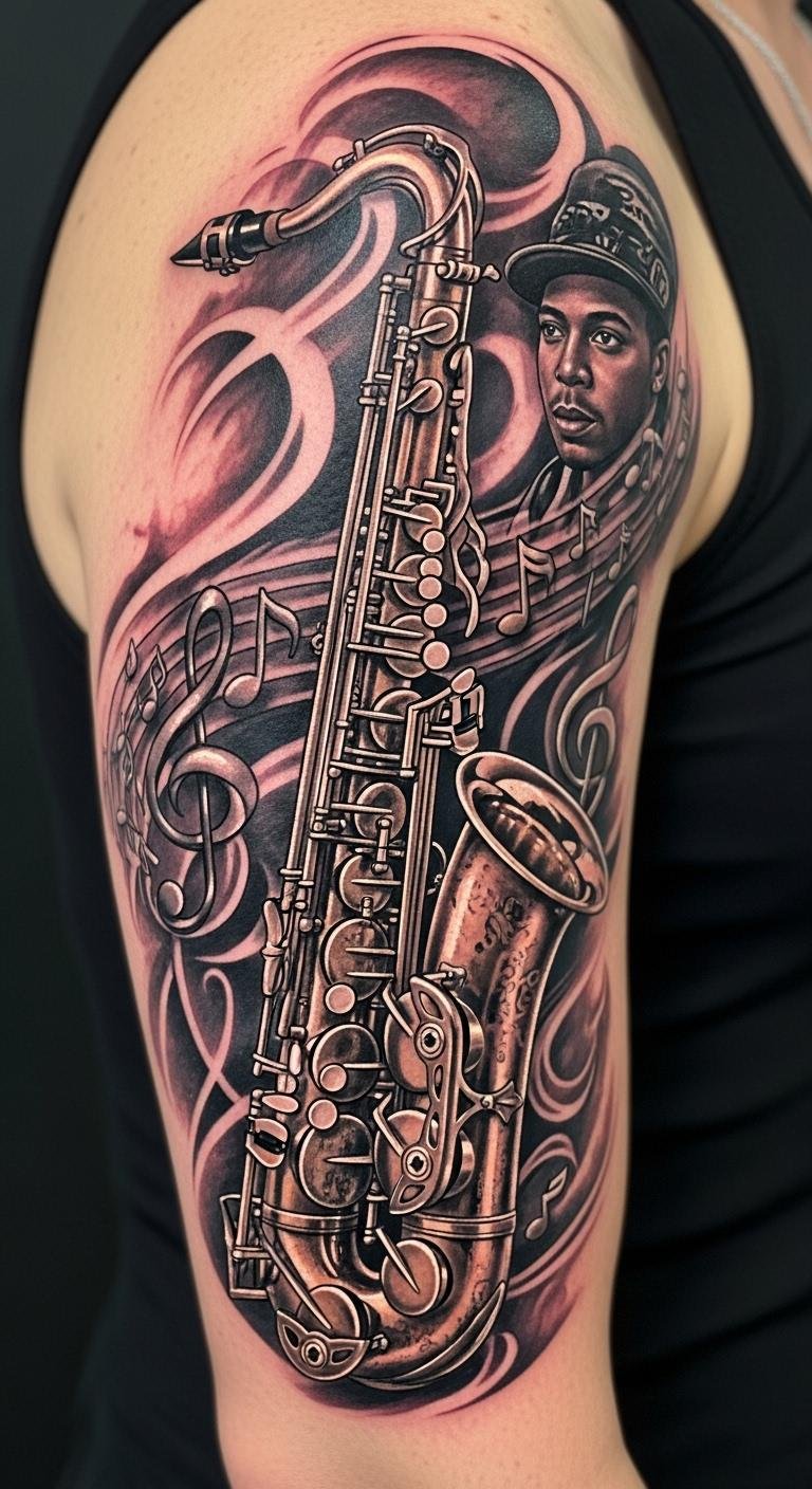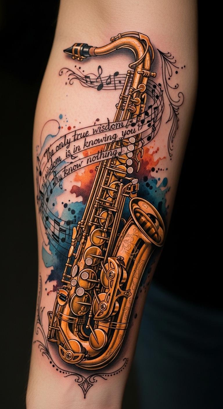 When you think of a saxophone tattoo, imagine a lifelike masterpiece that captures the instrument’s intricate details and vibrant essence.