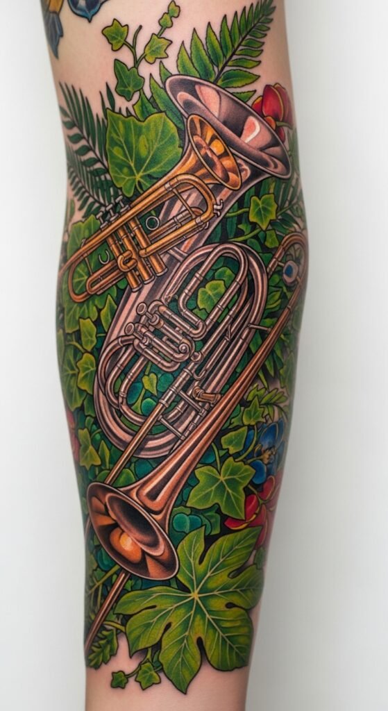 Vibrant shades of brass and lush greens breathe life into saxophone tattoos, transforming them into stunning visual symphonies.