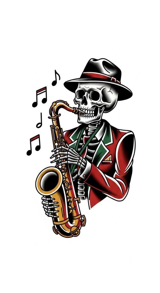 Flowing from the enchanting spirals and waves, skeleton saxophone player tattoos embody a mesmerizing fusion of life and artistry; their hollow eyes and animated posture symbolize both mortality and enduring creative spirit. The saxophone’s curves echoing the body’s own lines convey motion and song.