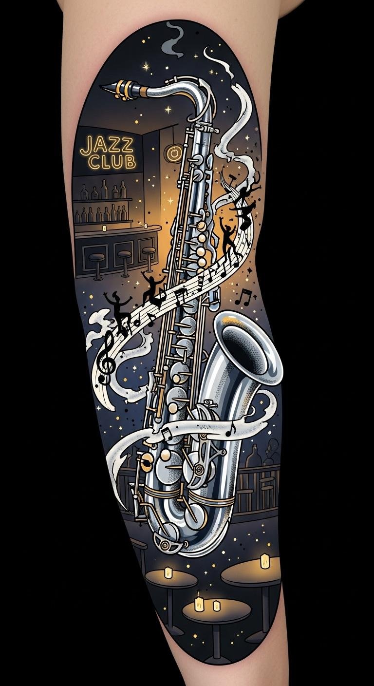 This tattoo concept channels sensuality and nocturnal energy—the saxophone represents voice and expression, the smoke and dancers symbolize transience and freedom, and the club silhouettes root it in communal night culture; place on the forearm for a flowing, visible statement or upper back for a broader scene that reads like a personal nocturne.