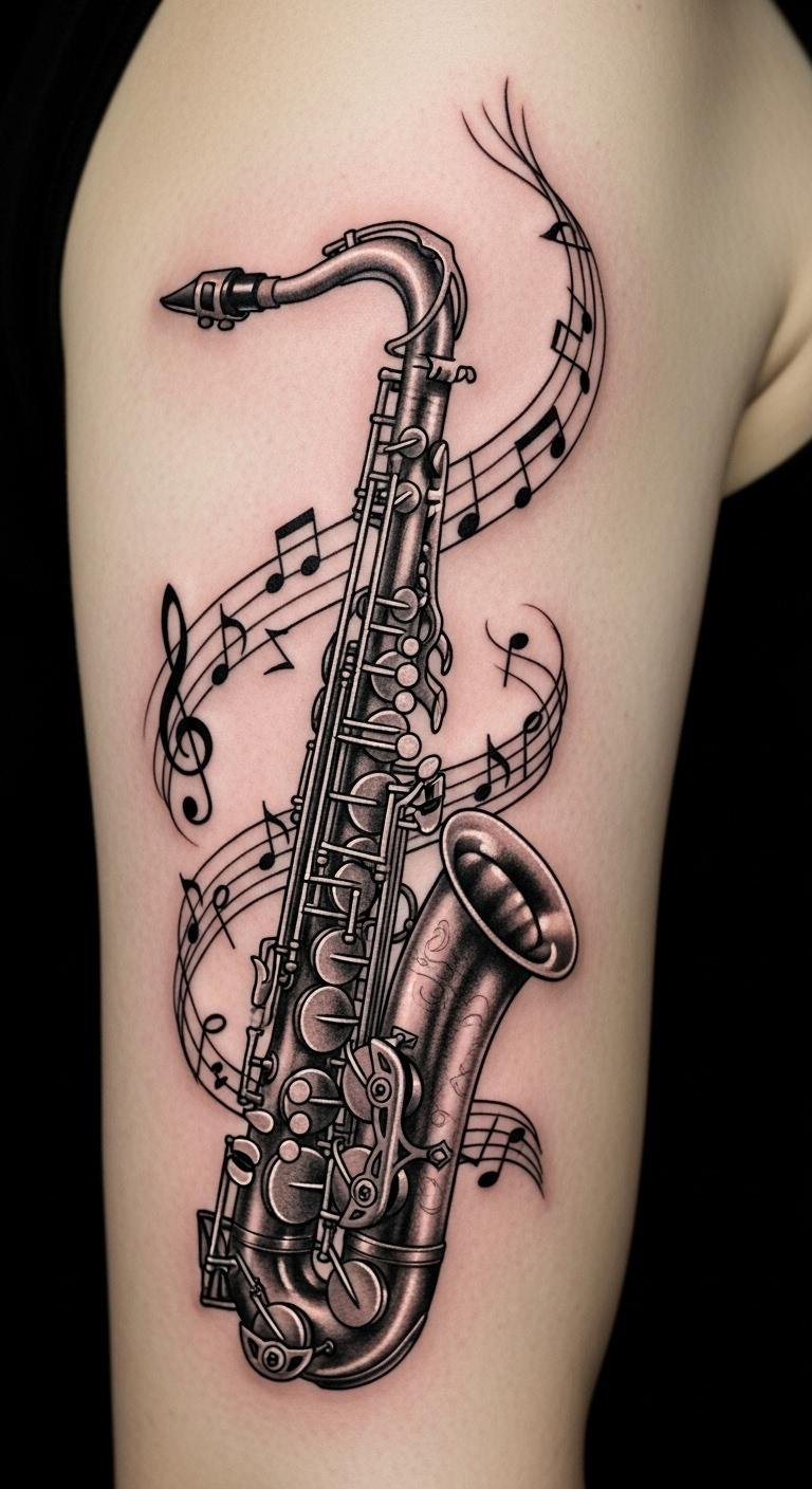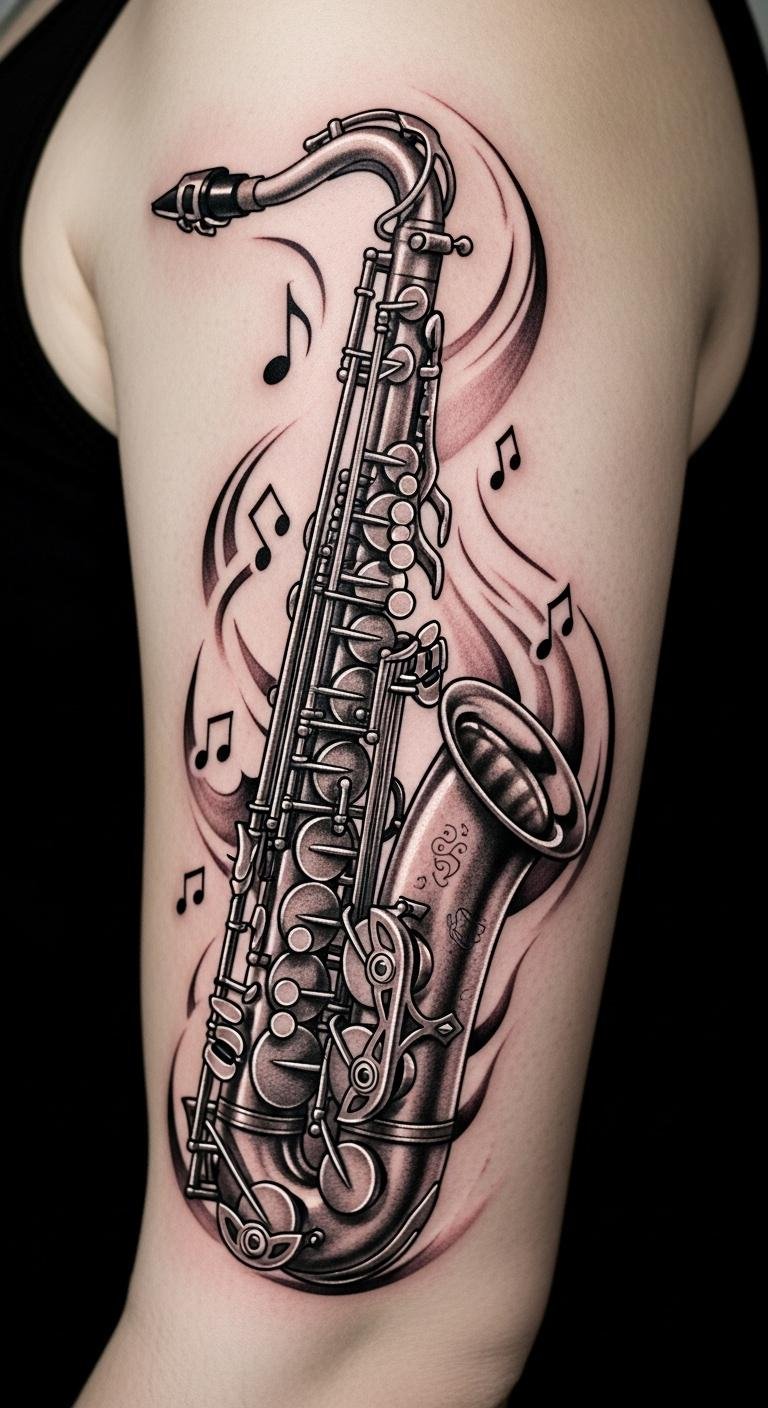 This design pairs lifelike saxophone rendering with rich, gradual shading to emphasize curves and intricate keys, creating a three-dimensional effect that seems to sing on the skin.