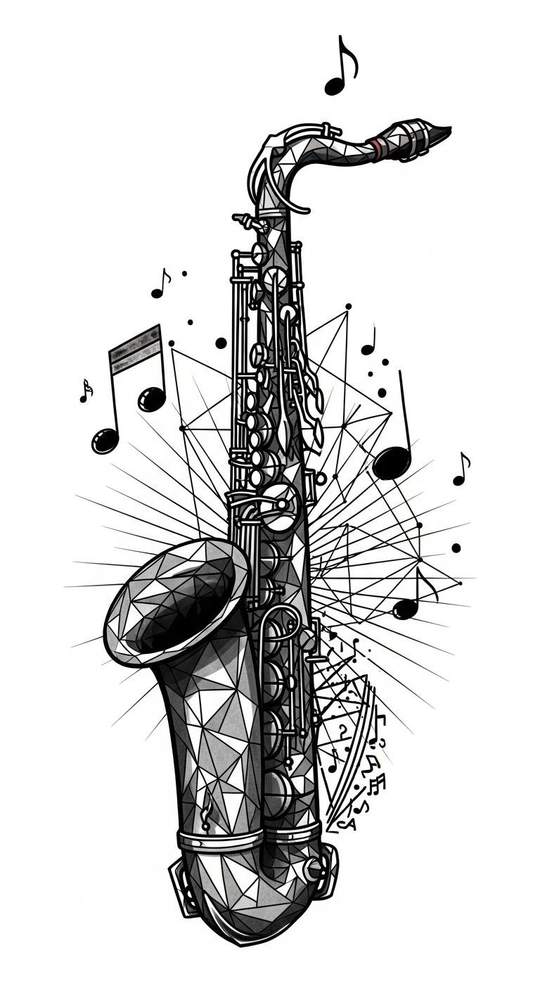 Geometric saxophone designs symbolize the convergence of precision and passion: intersecting triangles and hexagons form the saxophone body to represent rhythm and timing, while flowing angular lines suggest melodic motion and improvisation.