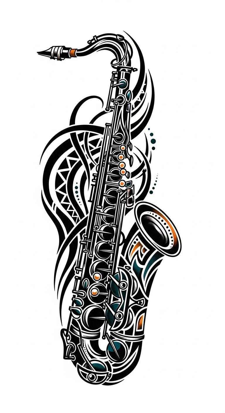 As you explore the world of saxophone tattoos, tribal-inspired designs stand out for their bold lines and intricate patterns that breathe life into the instrument’s form.