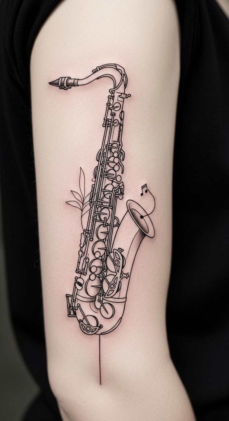 A slender single-line saxophone, outlined in fine black ink with a small musical note or soundwave trailing from its bell, symbolizes a quiet yet powerful devotion to music; the design evokes calm confidence and personal expression, ideal for placement along the inner forearm, behind the ear, or on the ribcage where its subtlety can feel intimate and easily revealed or concealed.