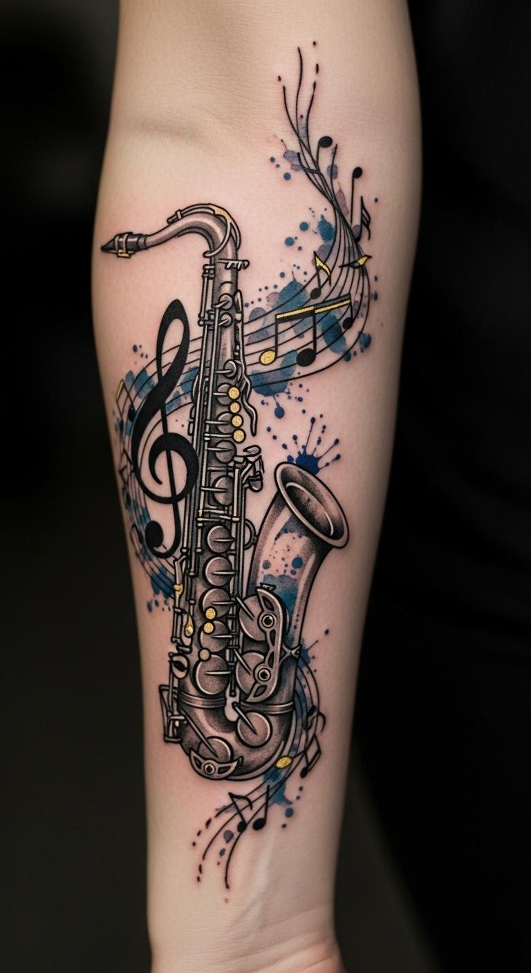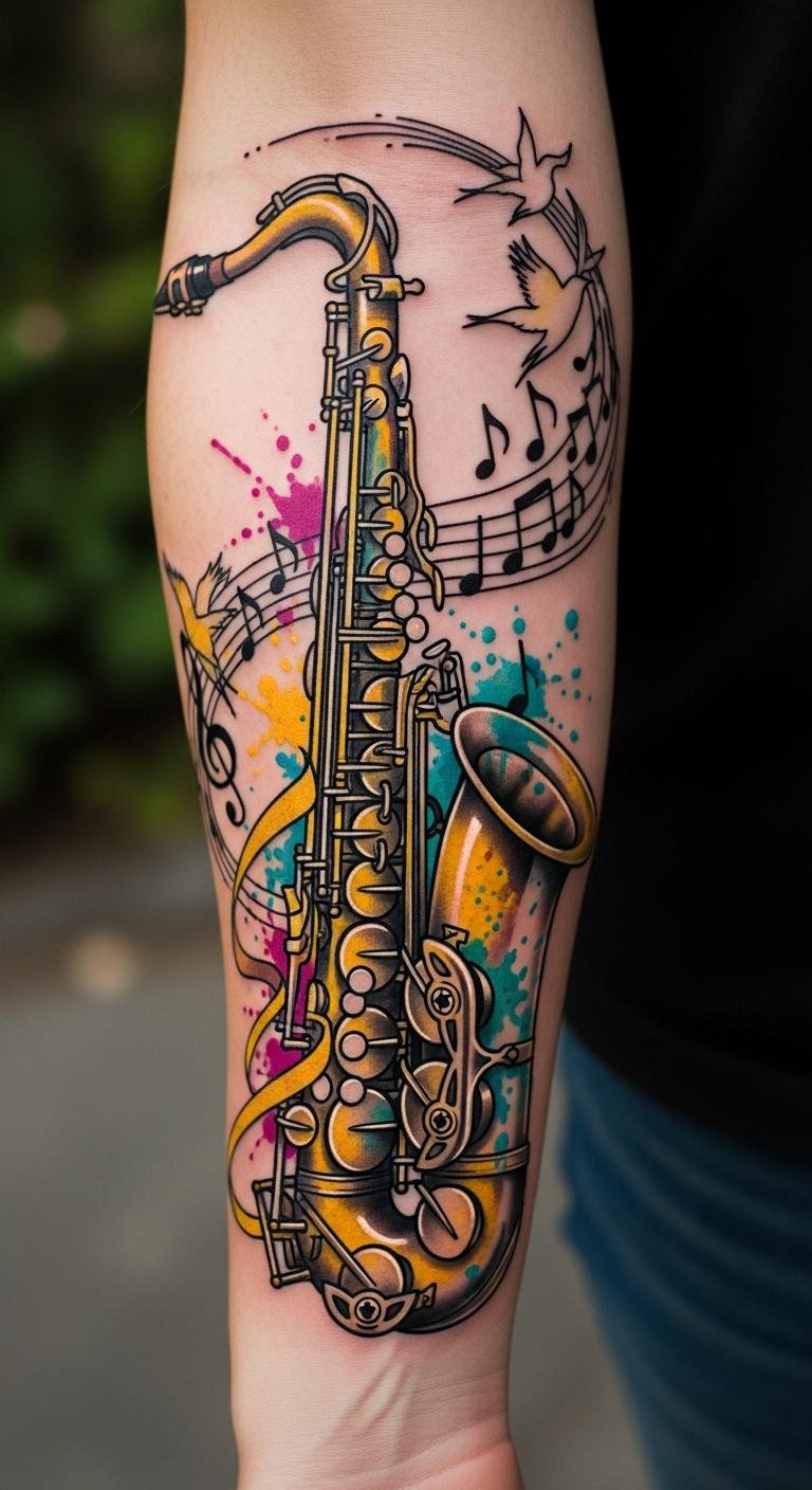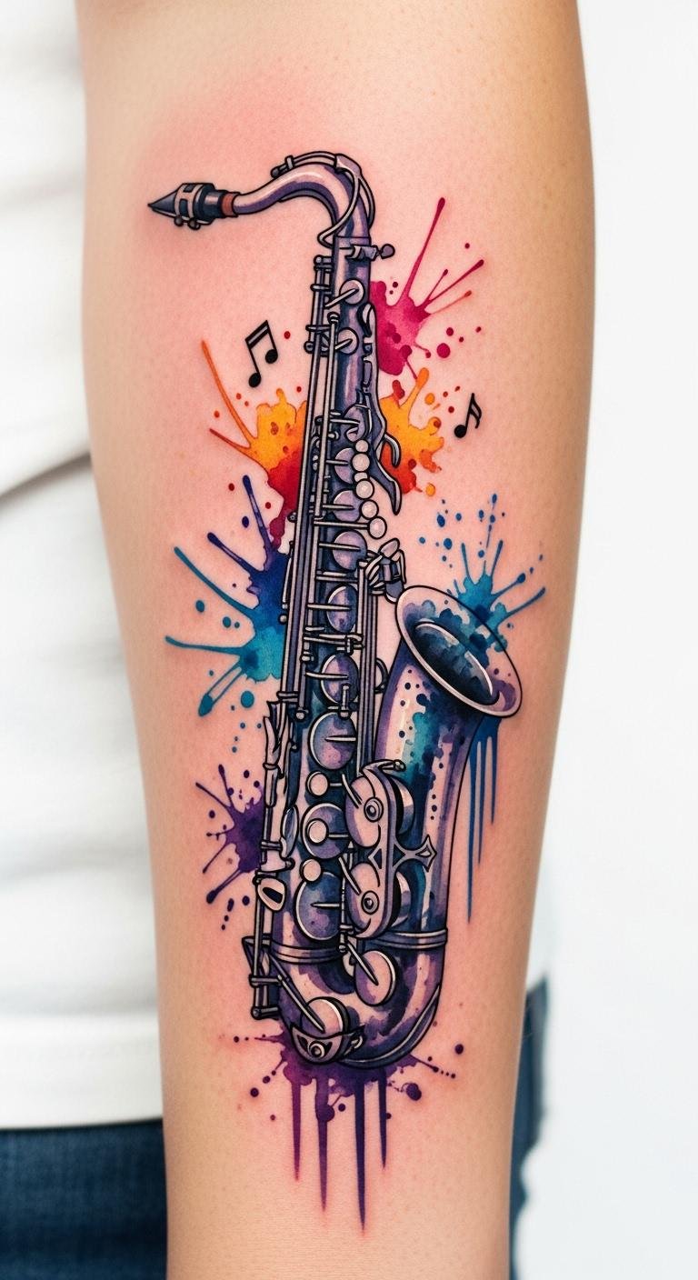 A watercolor saxophone tattoo symbolizes a fusion of sound and color, expressing improvisation, emotional depth, and creative spontaneity; its flowing pigments suggest musical movement and can wrap gracefully along the forearm, upper arm, or ribcage to mirror the instrument’s curve, while brighter hues convey joy and boldness and cooler tones evoke melancholy and soulful reflection.