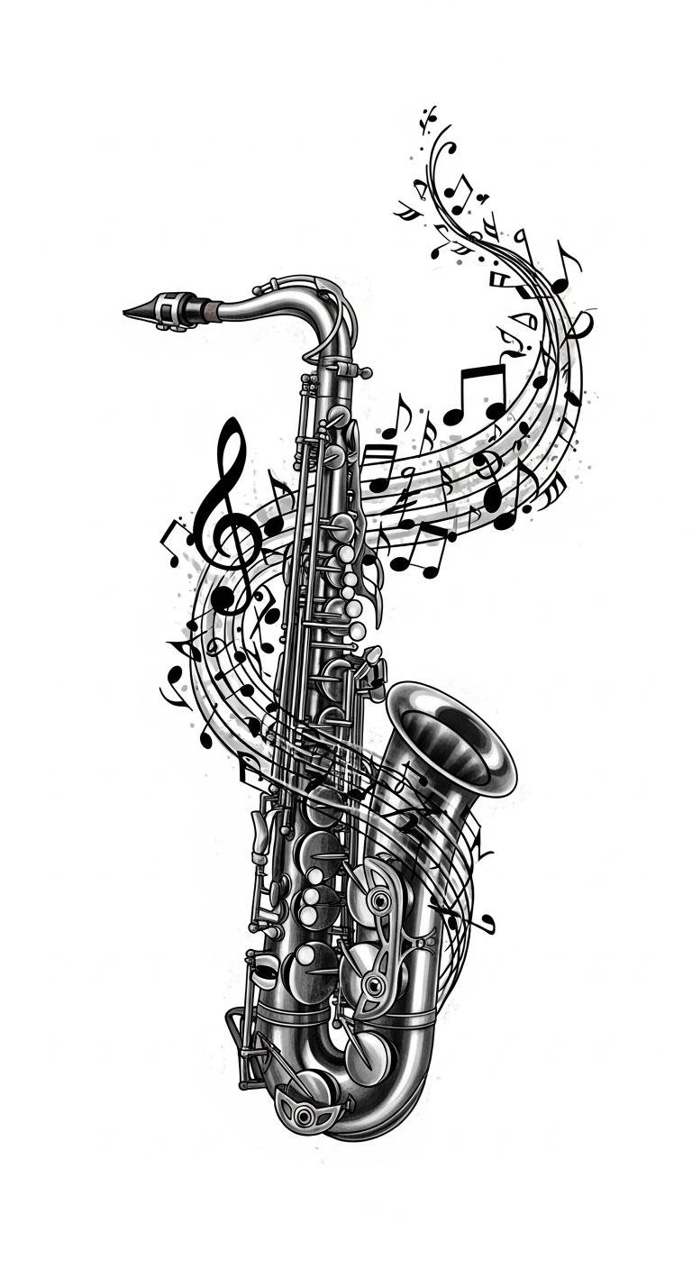 This design concept envisions a saxophone rendered in a hybrid style that blends realistic metallic detailing with flowing illustrative musical notes and watercolor splashes; the instrument curves naturally along the forearm or ribcage, with notes morphing into birds or abstract shapes that echo personal growth and freedom. Symbolically it marries passion for music with emotional release and individuality — the realistic saxophone grounds the piece in craft and dedication, while the loose colors and transformed notes evoke movement, memory, and transformation; ideal placements are the forearm, calf, or side rib to allow the design’s length and flow to read clearly and interact with body movement.