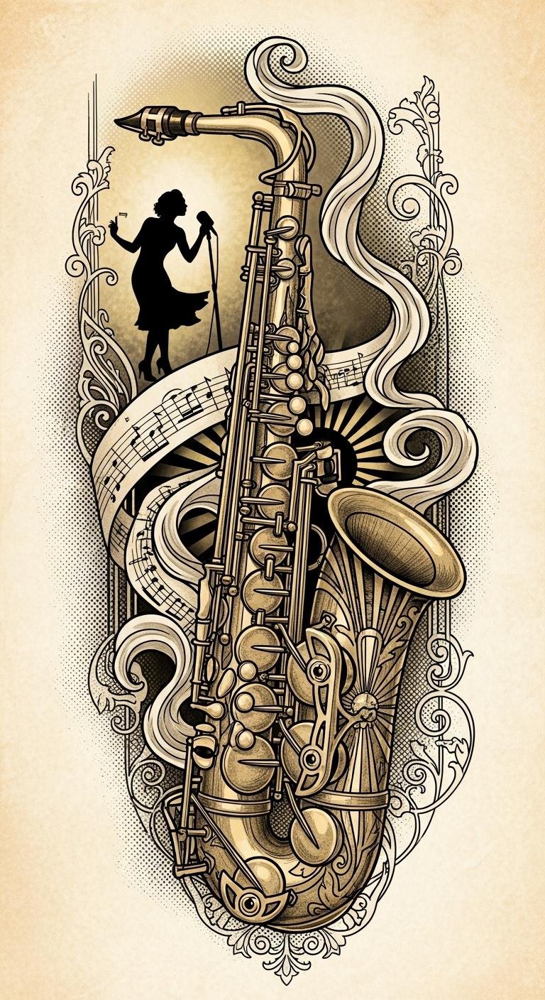 The design symbolizes reverence for musical heritage and personal expression—the saxophone as voice, the sheet-music smoke as memories and improvisation, the singer silhouette as muse; it evokes warmth, longing, and creative pride.