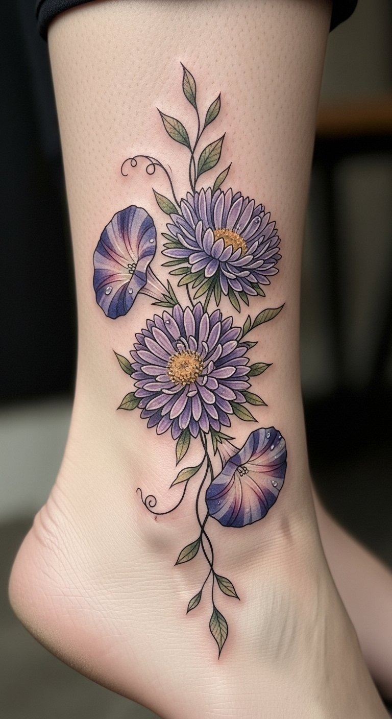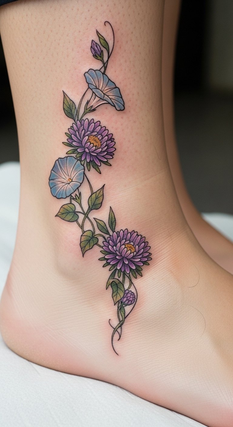 Ankle Tattoo With Aster and Morning Glory