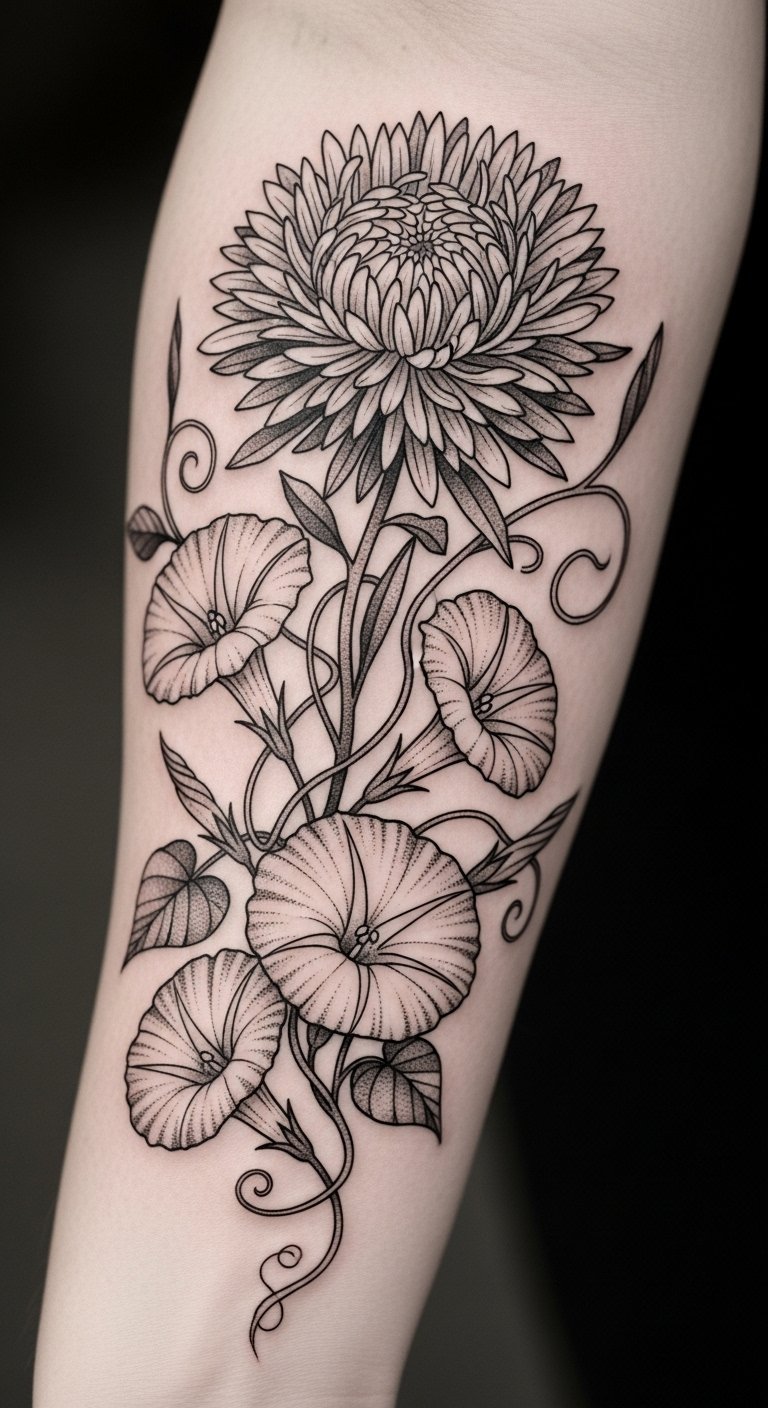 Building on the gentle elegance of aster tattoos, a statement piece that combines asters and morning glories offers a vibrant celebration of life and beauty.