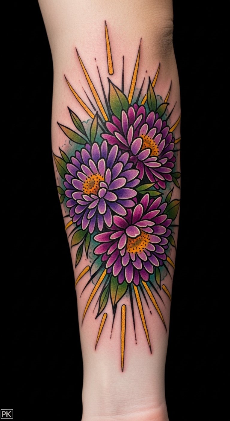 Building on the bold aesthetics of neo-traditional morning glory tattoos, aster tattoos adorned with sunray accents bring a fresh and radiant energy to your forearm.