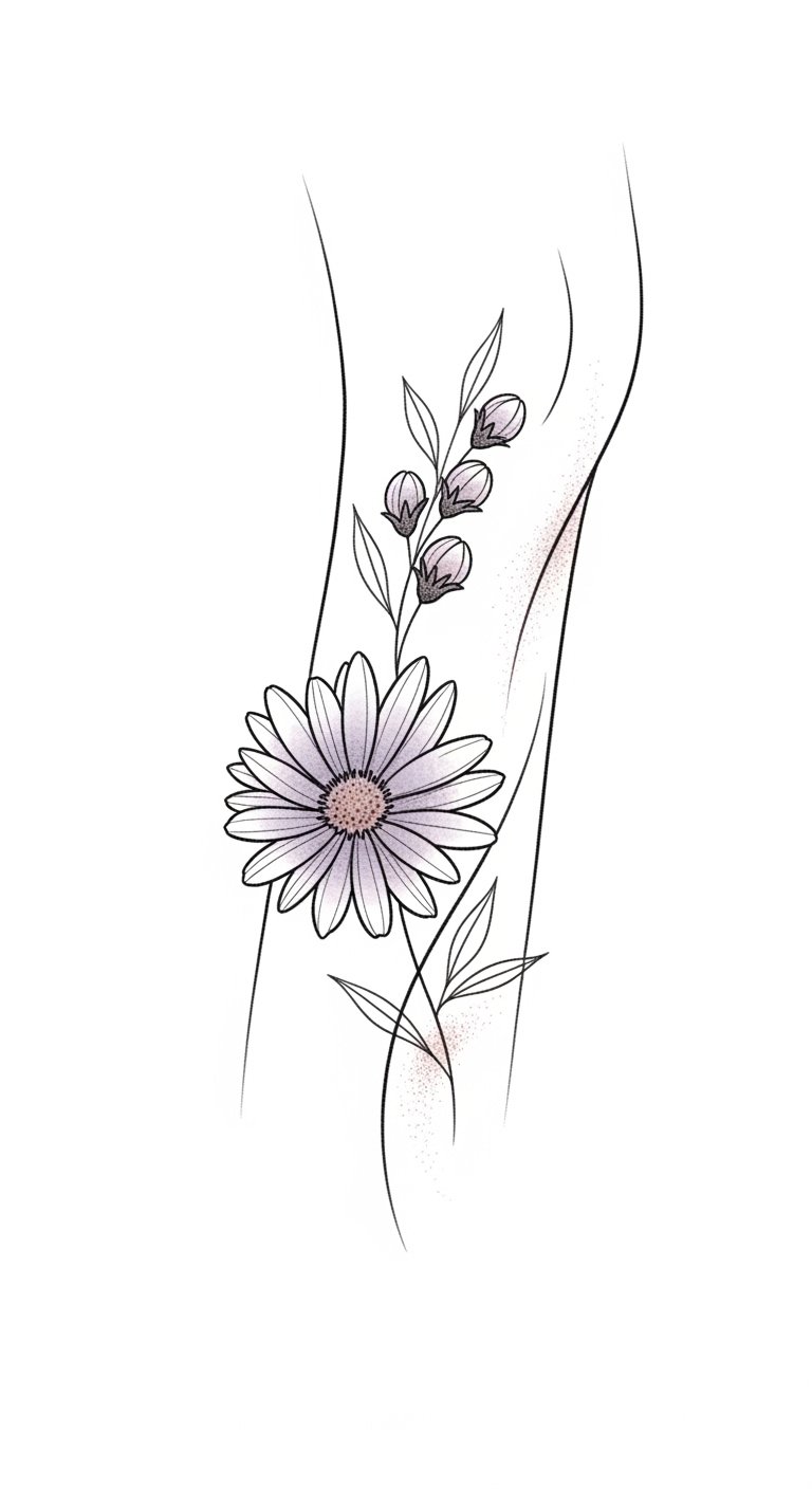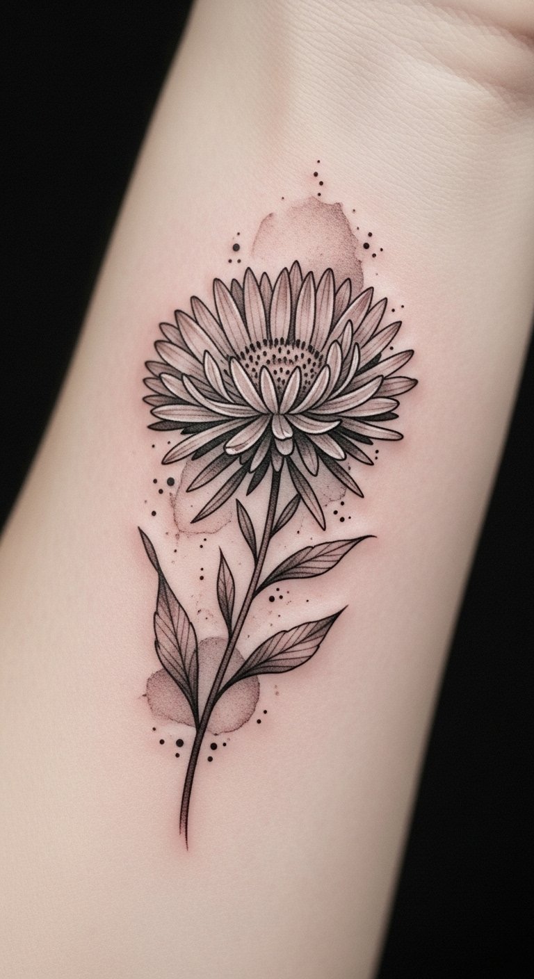 Realistic shading brings depth, making each petal pop with life. This design not only celebrates your September birth flower but also embodies your unique style and spirit. The aster symbolizes love, patience, and elegance; rendered in blackwork it evokes timeless strength and introspective beauty, suitable for forearm placement where emotion and detail can be viewed and shared, or wrapped subtly around the rib or calf for a more private, intimate expression.