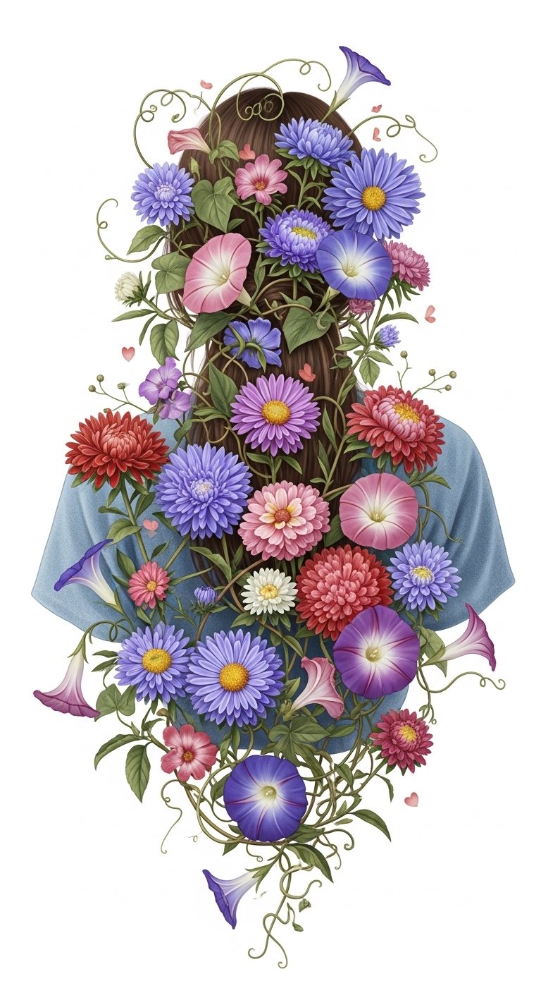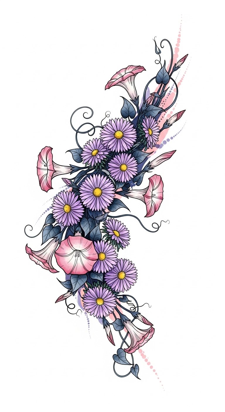 The asters symbolize patience, devotion, and elegance, while morning glories represent renewal, affection, and the fleeting beauty of each day; together they create an emotional narrative of enduring love and daily rebirth.