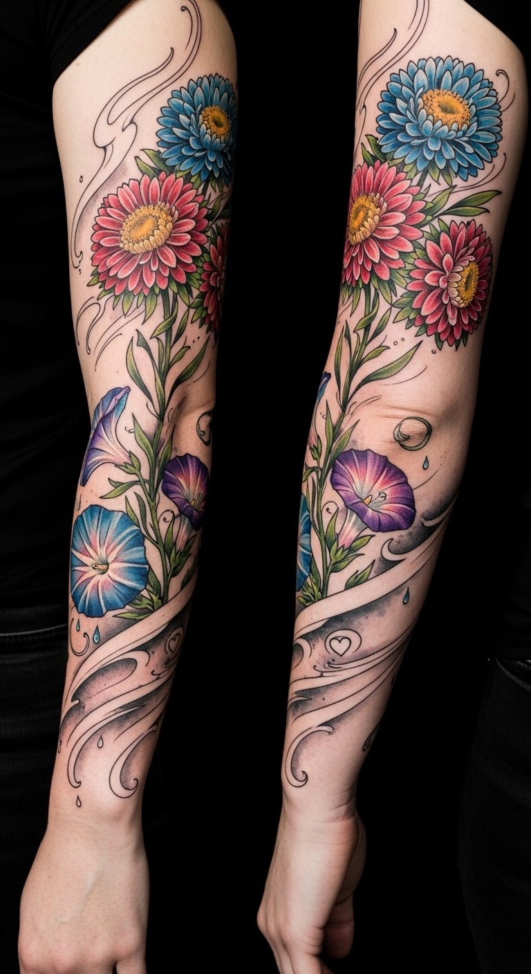 While you explore the vibrant world of body art, consider an arm sleeve that beautifully weaves together the enchanting symbols of September’s flowers—asters and morning glories.