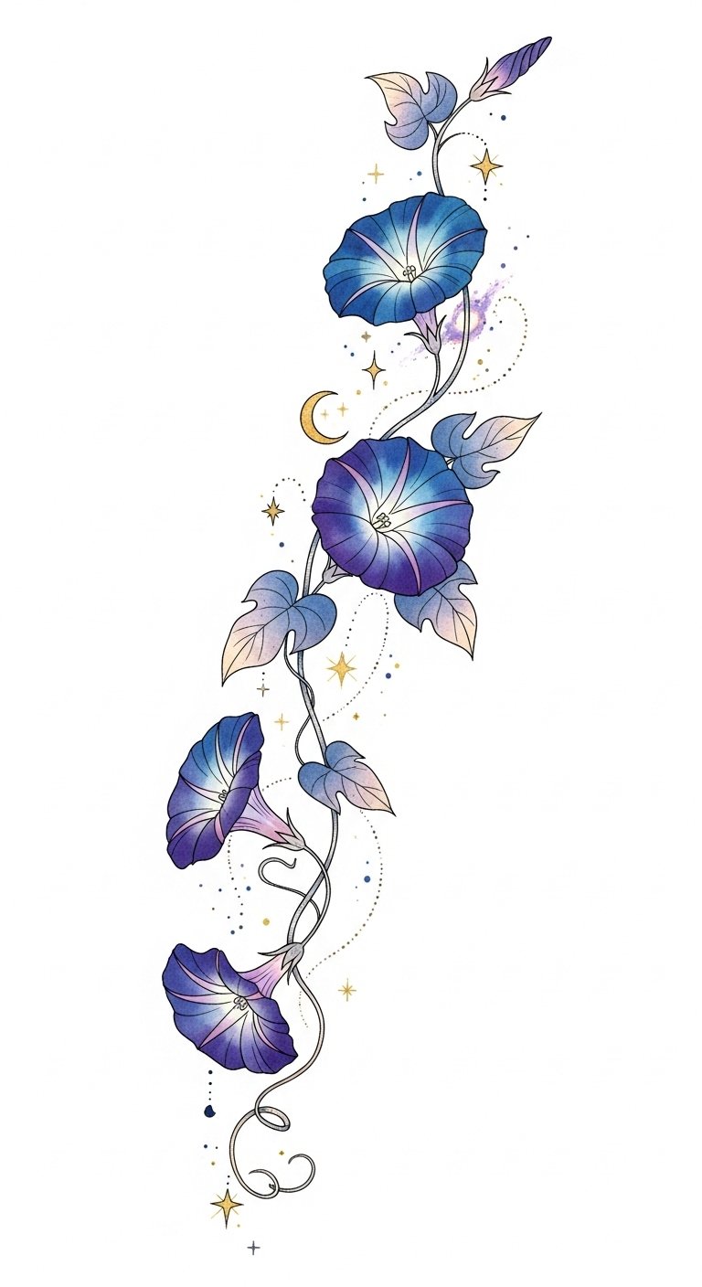 This design reflects morning glory symbolism, representing love and renewal, while the celestial elements evoke a sense of wonder.