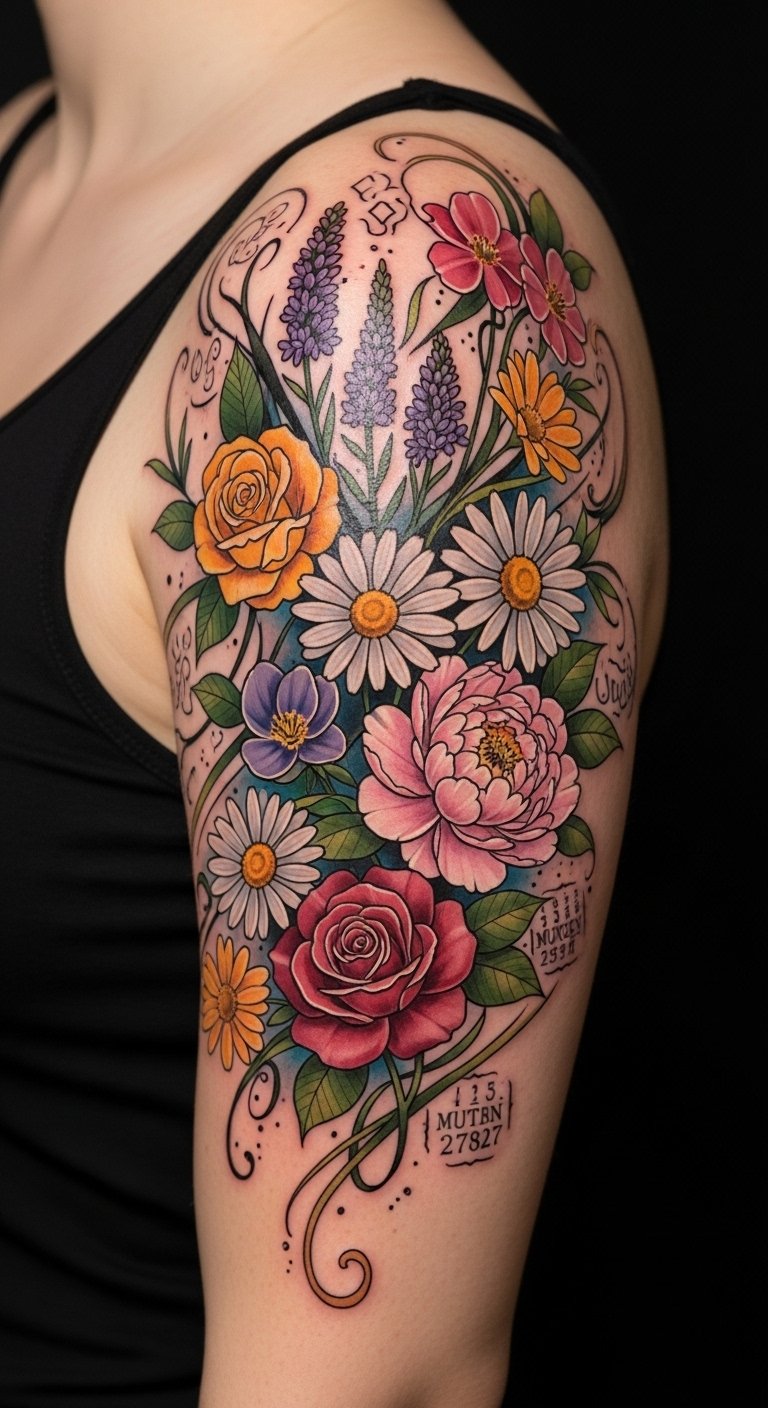 Place the design to flow with the natural contours of the shoulder and upper arm so movement enhances the sense of life and connection; symbolism in each bloom can represent personal traits, important relationships, or milestones, while the watercolor tones evoke emotional warmth and freedom.