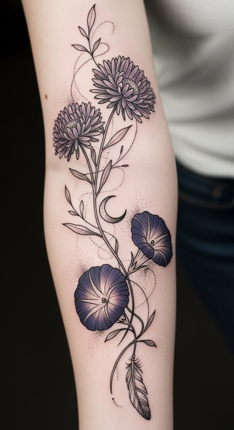 This design balances celebration and contemplative depth: asters convey love and wisdom, morning glories bring affection and mortality, while the crescent and falling petals add transience and freedom; ideal on the outer forearm or upper shoulder to allow movement and personal visibility.