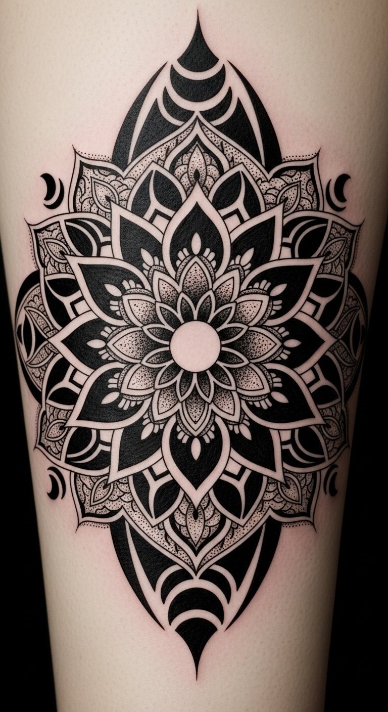Choosing a blackwork mandala tattoo not only enhances your style but also serves as a personal journey etched onto your skin. Place the design on the upper back or sternum for a centered, grounding effect that aligns with the spine and chest; emotionally it evokes introspection, stability, and quiet empowerment, while the heavy blacks and delicate dotwork balance boldness with subtle depth.